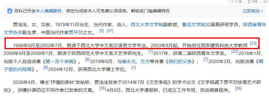 贾浅浅1979年11月出生,著名作家贾平凹之女,2000年至2003年西北大学中文系汉语言文学专业。至于为什么大学才读了三年,谁也不知道。2003年,贾平凹担任西安建筑科技大学人文学院院长、文学院院长。2003年8月至2018年7月,贾浅浅担任西安建筑科技大学教师。2015年11月西北大学成立贾平凹研究中心;2018年后贾浅浅成为西北大学教授。太巧了。