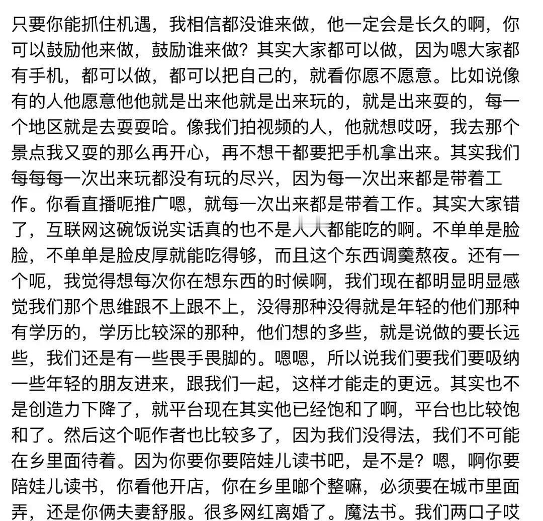 原来夫妻俩是想招年轻人加入,毕竟现在自媒体玩法更新快,年轻人懂流量、会创意,能给团队注入新活力。不得不说,这夫妻俩看得挺通透,能放下身段主动求变,难怪能把账号做这么久,期待他们的新团队搞出点新花样!
