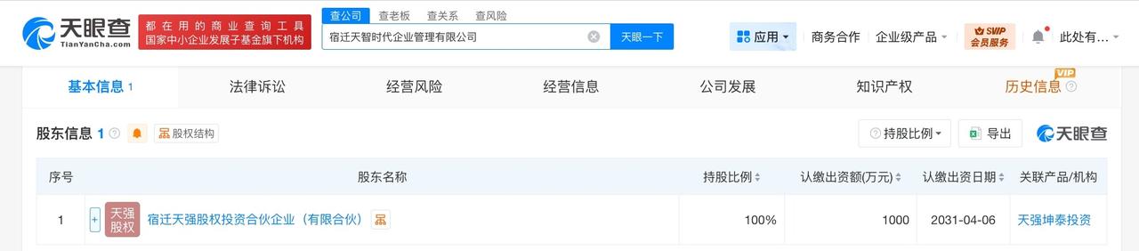 天眼查App显示,4月9日,宿迁天智时代企业管理有限公司成立,法定代表人为李瑞玉,注册资本1000万人民币,经营范围为企业管理、企业管理咨询、信息咨询服务、信息技术咨询服务、计算机软硬件及辅助设备批发、计算机软硬件及辅助设备零售等。股东信息显示,该公司由宿迁天强股权投资合伙企业(有限合伙)全资持股,后者由刘强东、章泽天及二人名下北京天强坤泰投资管理有限公司共同出资。