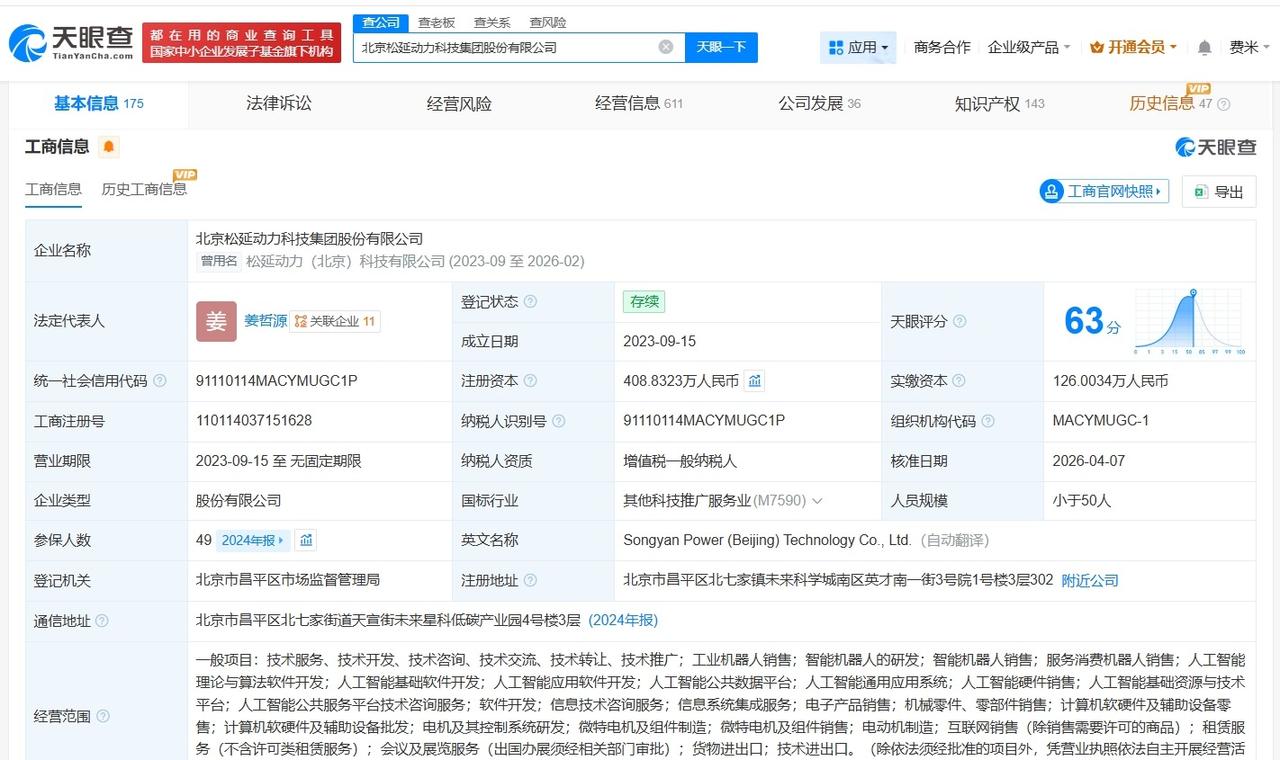 天眼查工商信息显示,近日,北京松延动力科技集团股份有限公司发生工商变更,注册资本由约324.6万人民币增至约409万人民币,增幅约26%。