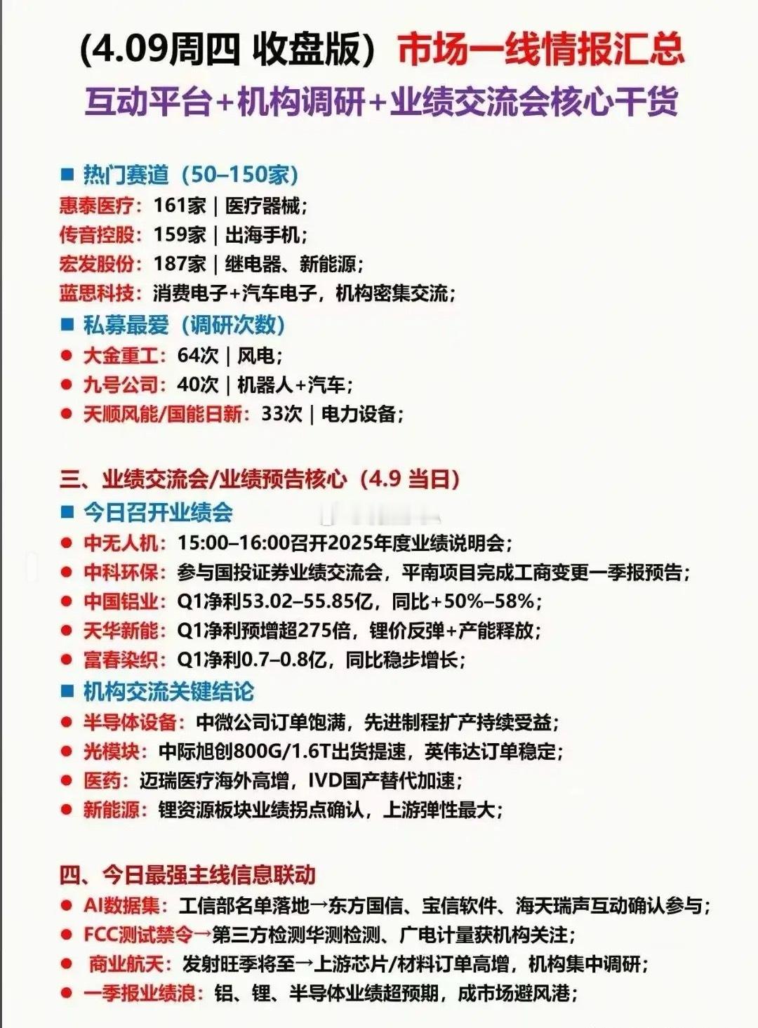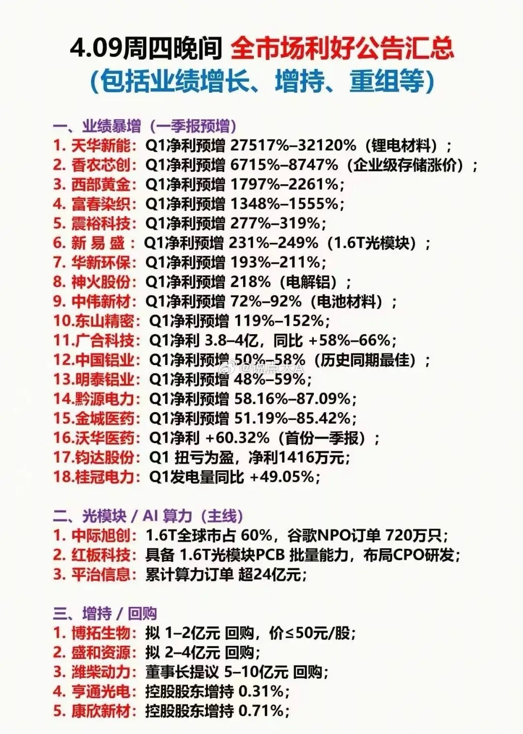 晚间利好密集落地,天华新能Q1净利预增超275倍,香农芯创、富春染织等业绩暴增;中际旭创1.6T光模块全球市占60%,谷歌订单超720万只;荣盛石化、山东黄金等大额增持回购,市场信心持续提振。机构调研热度聚焦AI算力、半导体设备,澜起科技、中微公司、中际旭创获超百家机构扎堆调研,一季报业绩超预期的铝、锂、半导体板块成为市场避风港,把握算力主线与业绩双轮驱动的投资机会!⚠️ 风险提示:以上内容仅为市场信息梳理,不构成任何投资建议,股市有风险,投资需谨慎。