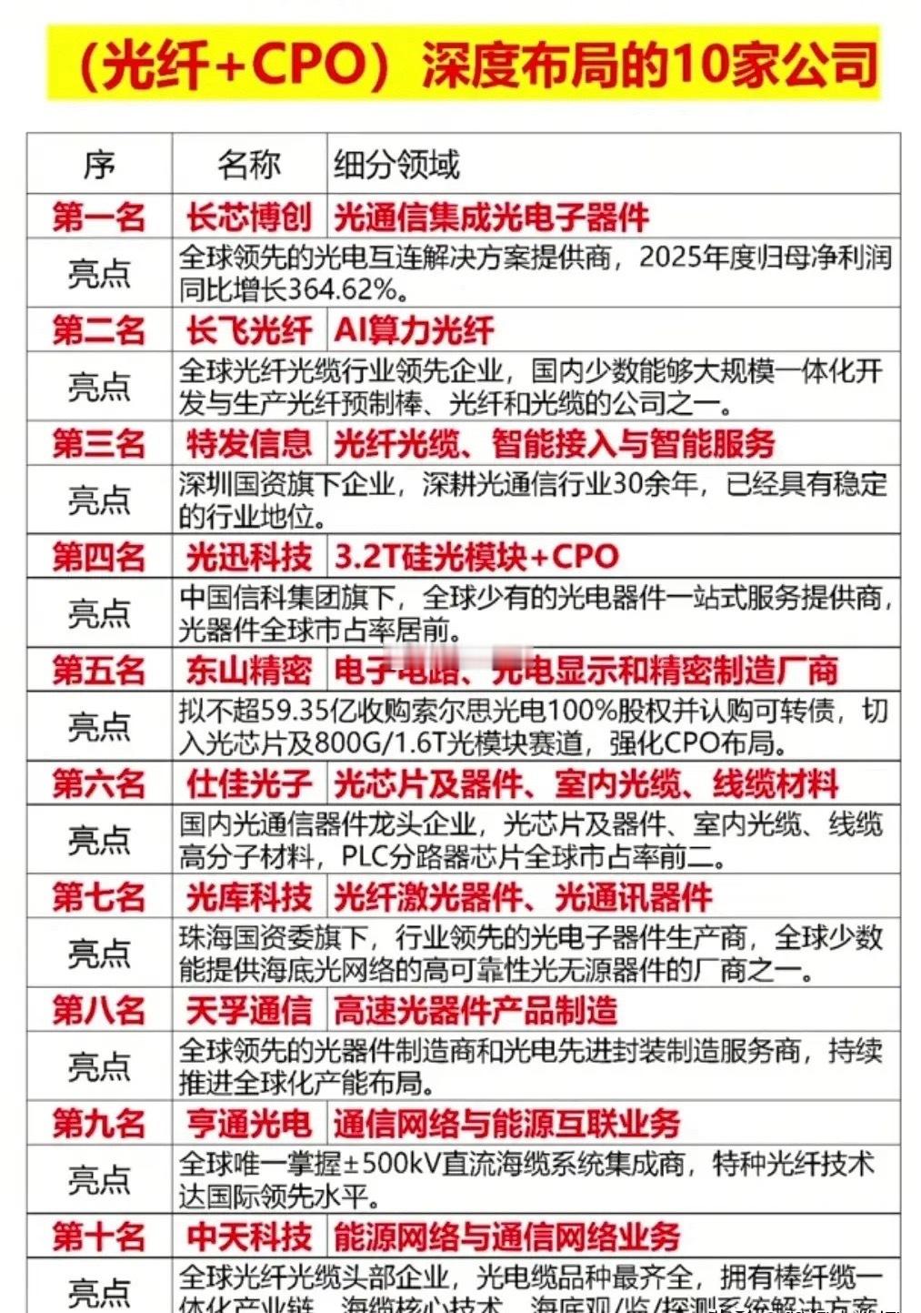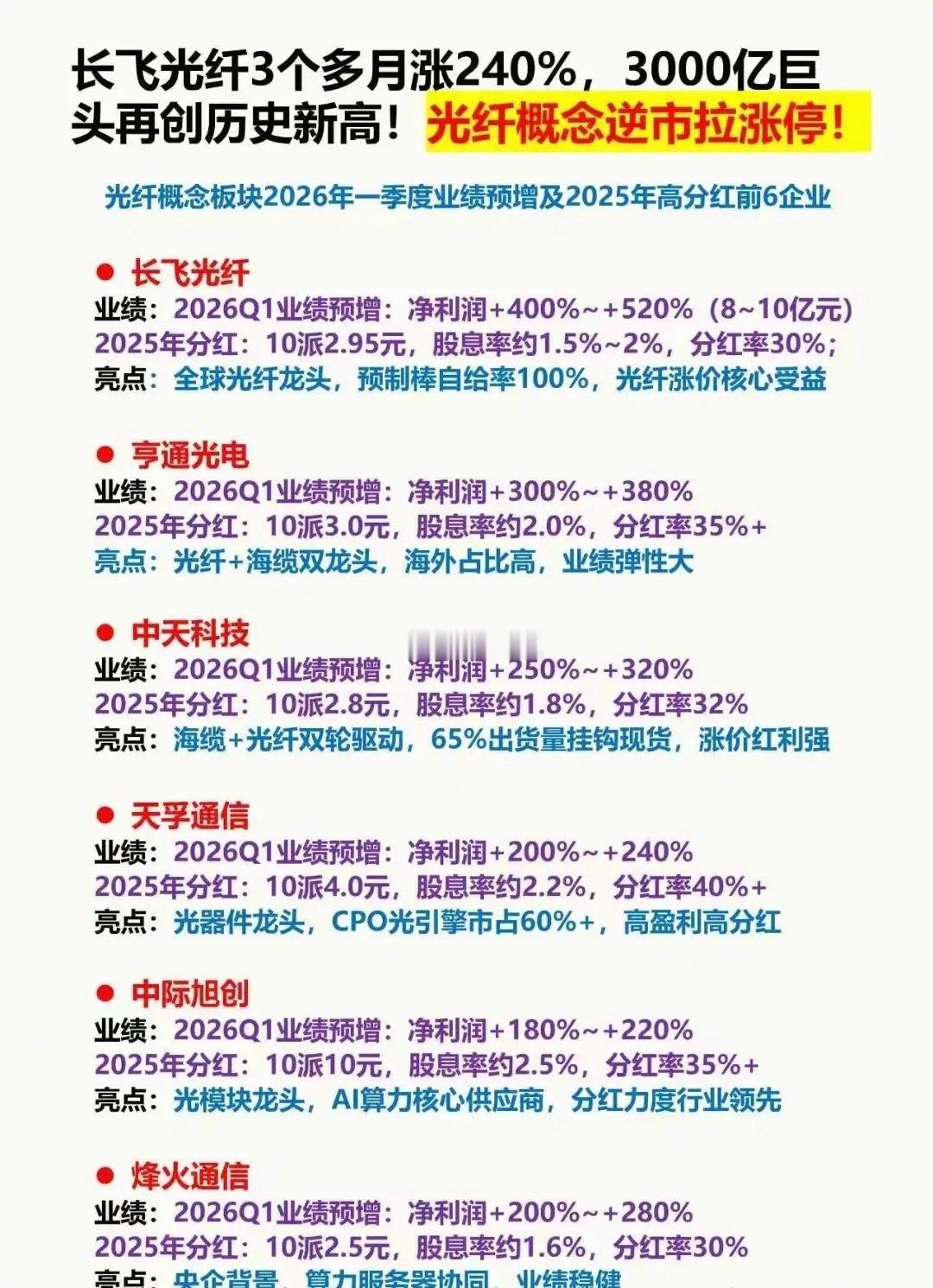 算力主线彻底爆发,光纤/CPO领涨,一季报业绩利好浪潮来袭!昨日A股算力主线全面走强,光纤、CPO、液冷服务器等赛道多点开花,汇源通信5连板、长飞光纤涨停,光迅科技、天通股份等多股封板,光纤价格持续暴涨带动产业链业绩集体预增,长飞光纤Q1净利预增超400%。