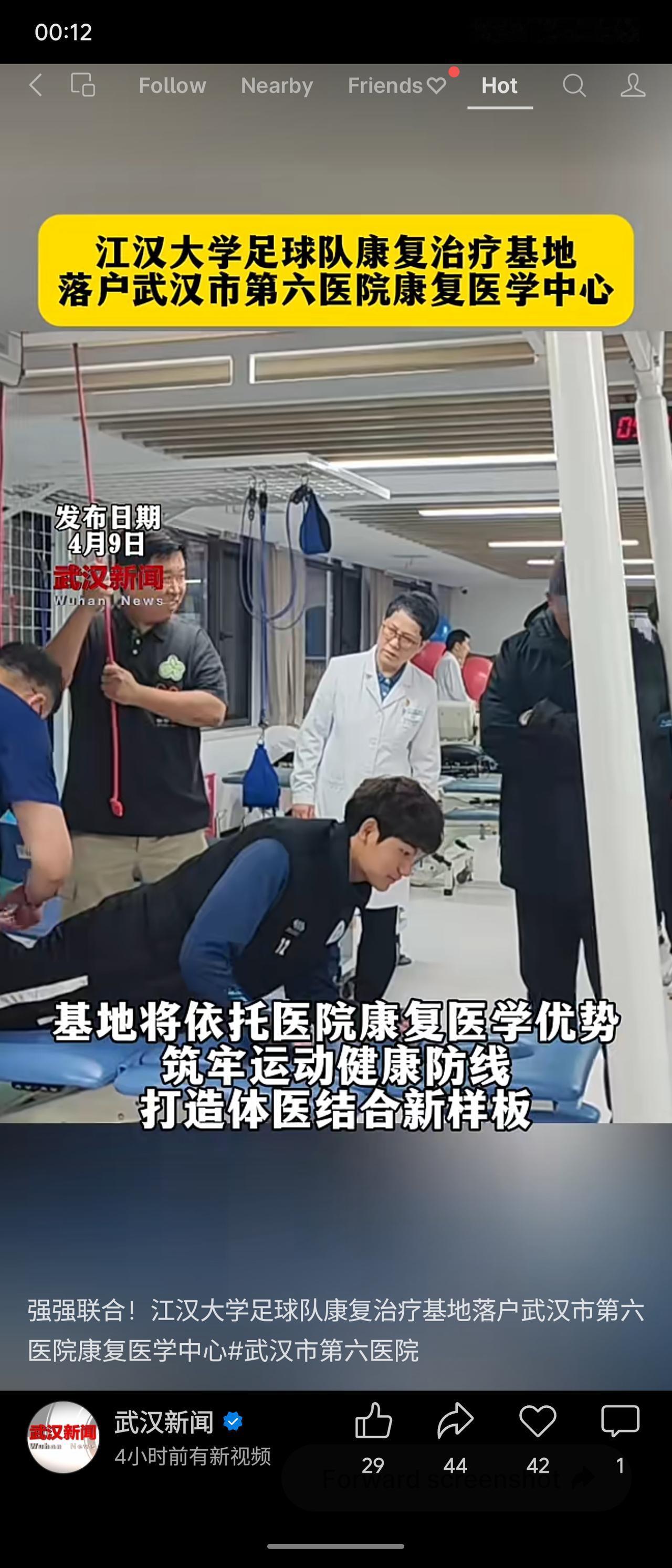 4月9日,江汉大学足球队康复治疗基地落户武汉市第六医院康复医学中心。双方将依托医院康复优势,深化校医协同、体医融合,筑牢运动健康防线,打造体医结合新样板。评价:这是体医融合的积极实践,既保障了运动员健康,也推动了康复医学与体育实践的深度结合,值得推广。