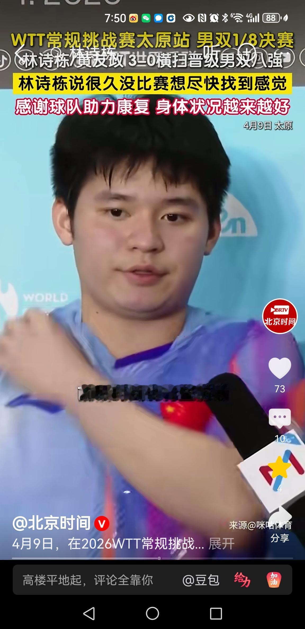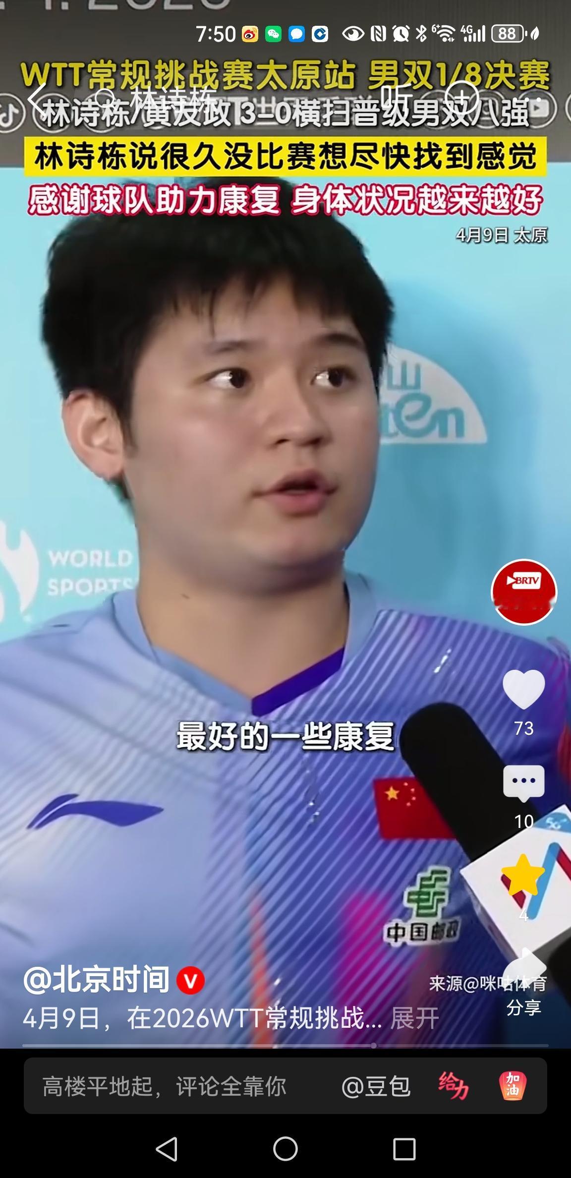 林诗栋伤病复出,首战告捷[给力] 太原常规赛,林诗栋伤病后复出,参加男双比赛 林