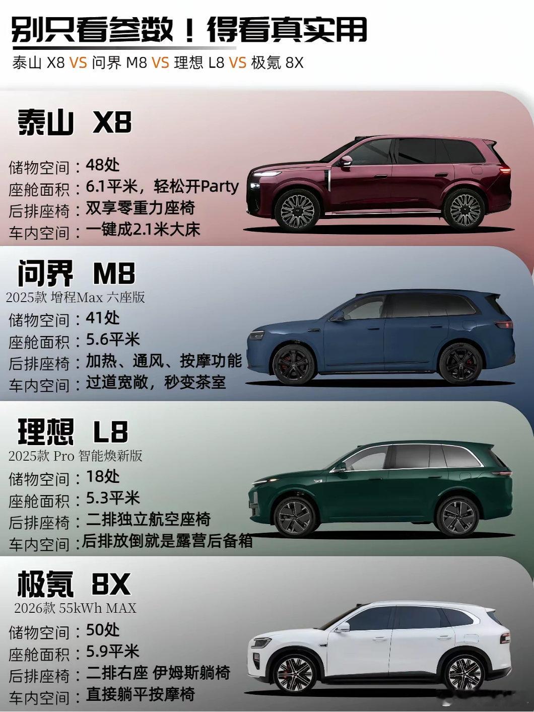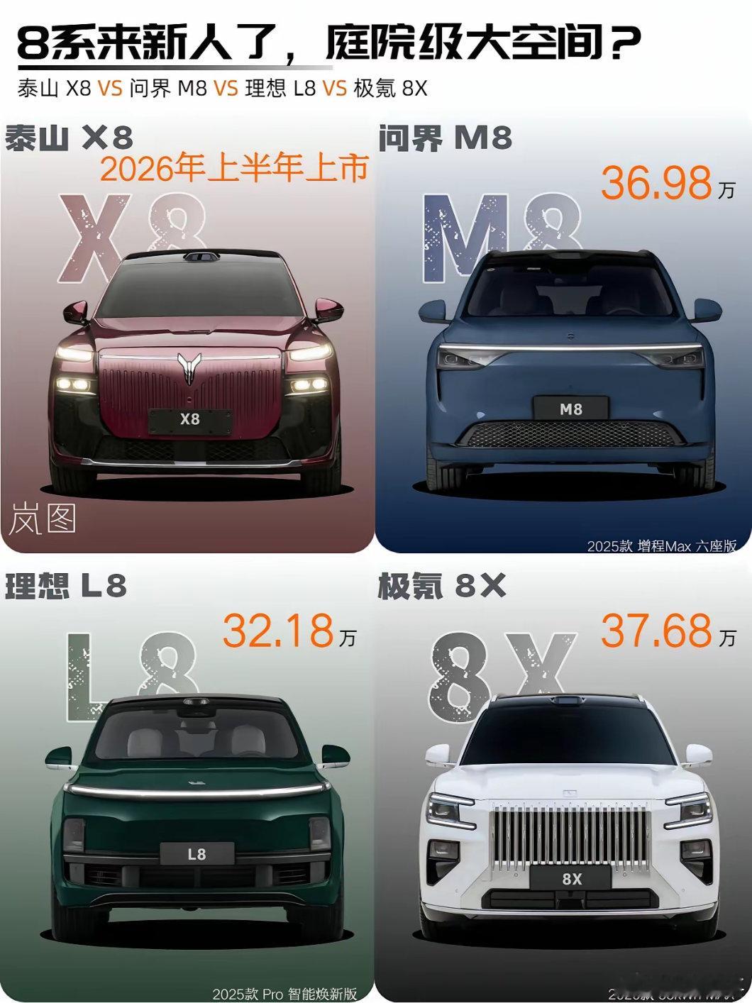 “8系”家族又来新人了,庭院级大空间?8系SUV正式进入大乱斗时代!如今市场上热门的三款车:问界M8、理想L8、极氪8X遇上新人:岚图泰山X8,当8系成为市场热门的主流符号,一场针尖对麦芒的较量便开始了。今天咱们就从外观设计、空间尺寸和辅助驾驶配置三个方面来比比看!外观设计:岚图泰山X8以顶天立地设计理念,塑造出豪华又不失中式美学的气场。问界M8前脸设计简洁规整,外观风格沉稳大气,整体造型稳重。理想L8以稳重实用为核心基调,整体中性化风格。极氪8X的宽体低趴姿态自带强烈视觉张力。空间尺寸:岚图泰山X8定位庭院级大五座SUV,车身尺寸为5200×2025×1814mm,轴距3090mm,凭借越级空间(车内6.1㎡)能提供舒适的乘坐体验,还能轻松化身专属衣帽间,差旅外出临时更换衣服十分方便;午间饭后,躺在二排双享零重力座椅上小憩十分舒适。车内还可以一键成2.1米大床,一家人玩累了躺在车里也不拥挤。问界M8车身尺寸为5190×1999×1795mm,轴距为3105mm,内部得房率达到67.6%,并配备了前备箱,储物灵活方便。理想L8采用2+2+2六座布局,车身尺寸为5080×1995×1800mm,轴距为3005mm,常规后备箱容积为313L;第三排可以满足应急乘坐需求。极氪8X车身尺寸为5100×1998×1780mm,轴距为3069mm,整体宽体低趴设计,得益于四轮四角布局,后备箱容积能达到1133L。辅助驾驶:岚图泰山X8是8系SUV中首发搭载四激光乾崑智驾ADS的,属于第一梯队水准;4颗激光雷达能精准识别不同物体,不管是夜间高速道路还是乡村复杂场景都能轻松识别应对。问界M8搭载华为乾崑ADS 4.0高阶智驾系统,配备2颗激光雷达,共计34个传感器,能实现全场景自动泊车、城区NCA等功能。理想L8搭载了理想AD Pro,算力达到128TOPS,主打高速NOA,车位随心画功能也十分好用。极氪8X的G-ASD高阶智驾主打类人决策+全场景NOA+高算力冗余,做出的决策更像一位老司机。总结:到底该怎么选还得看自身需求,岚图泰山 X8主打庭院级大5座空间,辅助驾驶配置也高;问界M8给人一种精英老板人设,低调沉稳不失大气;理想L8六座布局,出行轻松不用担心坐不下;极氪8X偏向性能巅峰,驾驶操控感一流。庭院级大五座SUV 8比9大 不是所有五座SUV都能叫庭院级 岚图泰山X8 理想L8 极氪X8 问界M8 岚图泰山X8上市