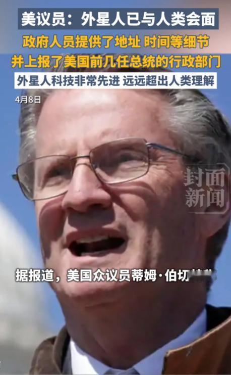 2026年4月7日,美国田纳西州共和党众议员蒂姆·伯切特在一场直播采访中,他竟然大肆宣称,外星人已与人类会面,政府人员提供了地址、时间等细节,并上报了美国前几任总统的行政部门,“外星人科技非常先进,远远超出人类理解”。
