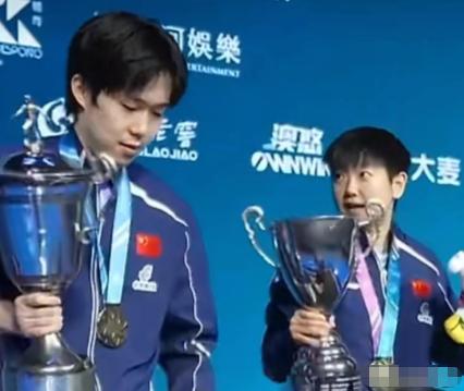 澳门世界杯颁奖礼上,王楚钦一直盯着孙颖莎的奖杯,突然冒出一句:“你的奖杯帽儿呢?