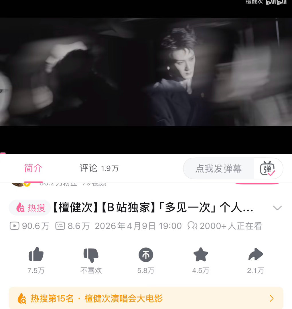 檀健次【多见一次】巡回演唱会大电影 14小时 累积90万播放量,同时登上啊b热搜第一