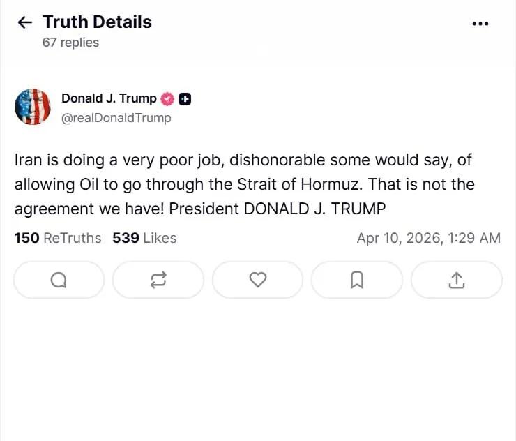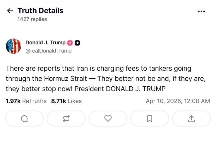 针对伊朗在霍尔木兹海峡过往油轮收费问题,特朗普今天(北京时间4月10日)连发两文反对伊朗单方面收费,他表示:“有报道称,伊朗正在向通过霍尔木兹海峡的油轮收取费用——但愿情况并非如此,如果属实,他们最好立即停止。”