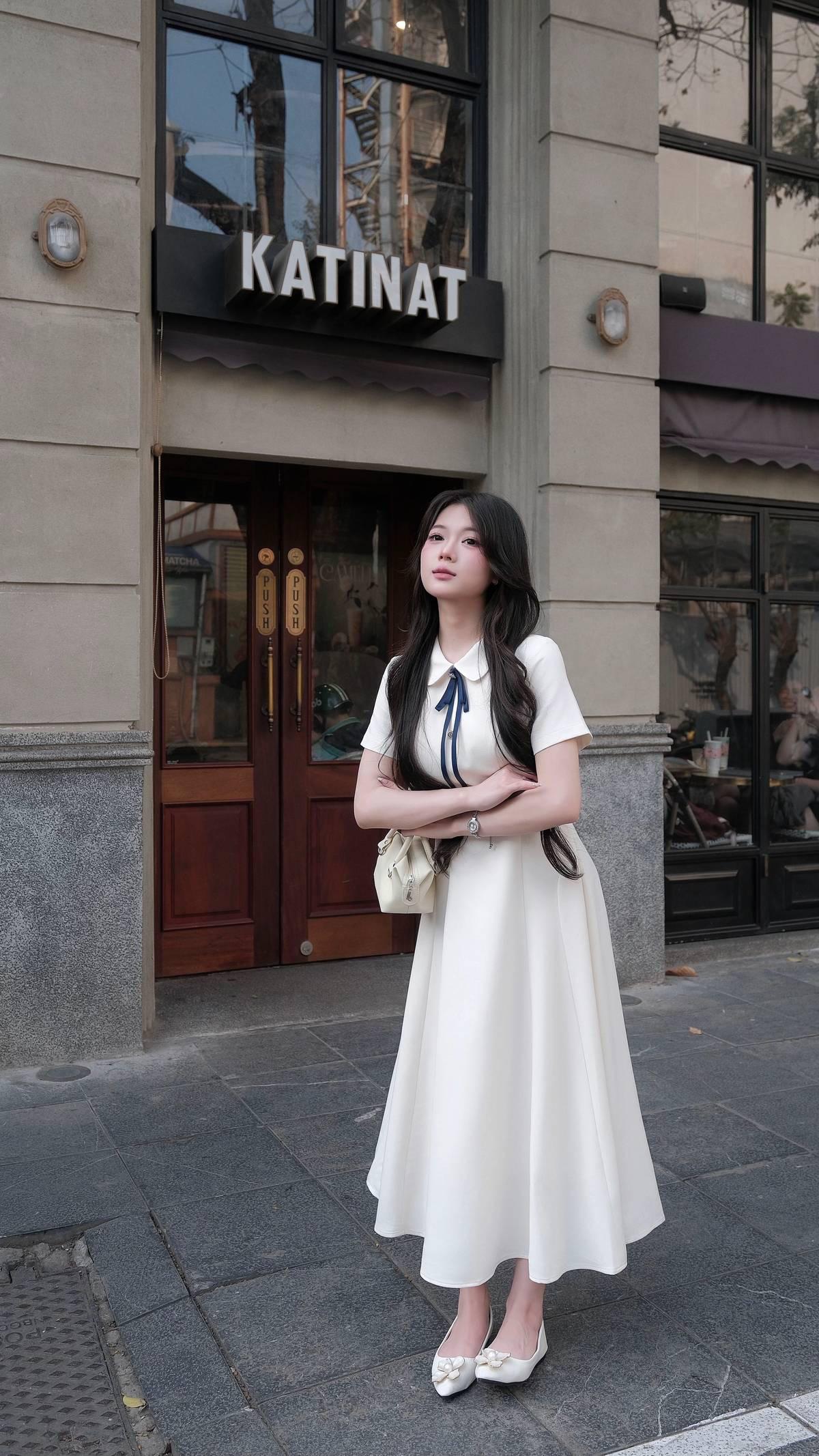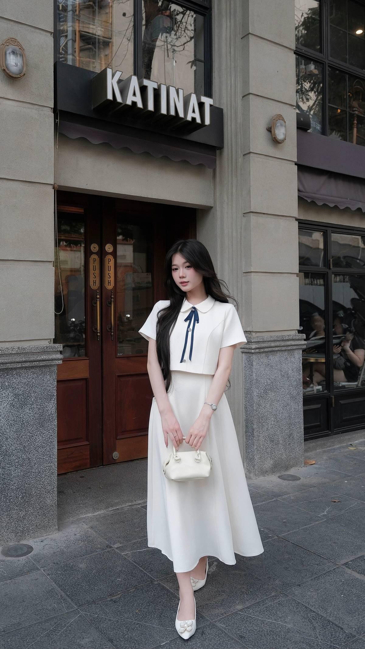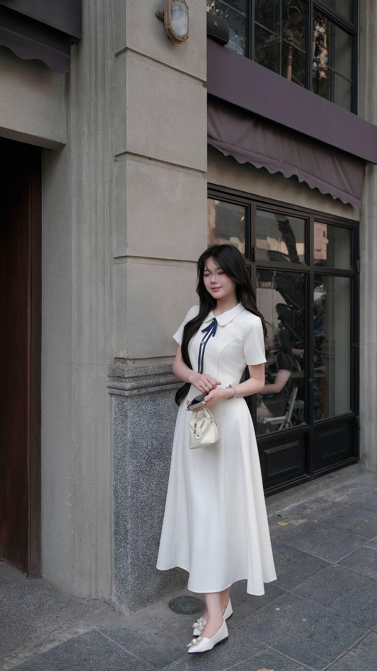 奶白色娃娃领设计直接把温柔焊在身上,藏青小领结点缀,甜而不腻,瞬间拉满学院感,秒变韩剧里的温柔学姐👩‍🎓