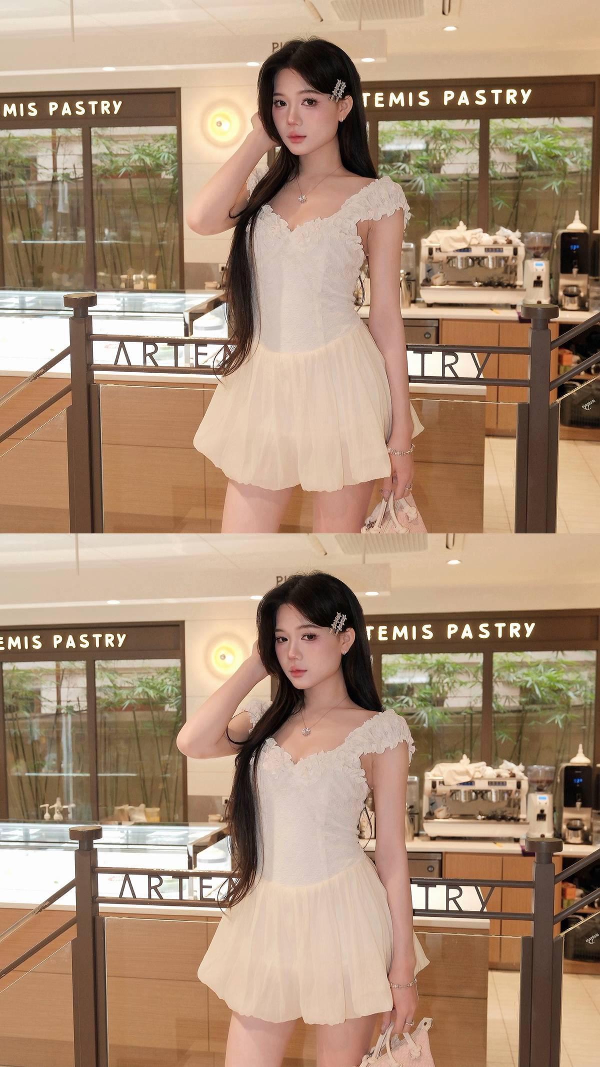 领口和肩带的木耳边设计超精致,自带温柔滤镜,修身版型勾勒曼妙曲线,裙摆轻盈灵动,转身瞬间全是仙气~