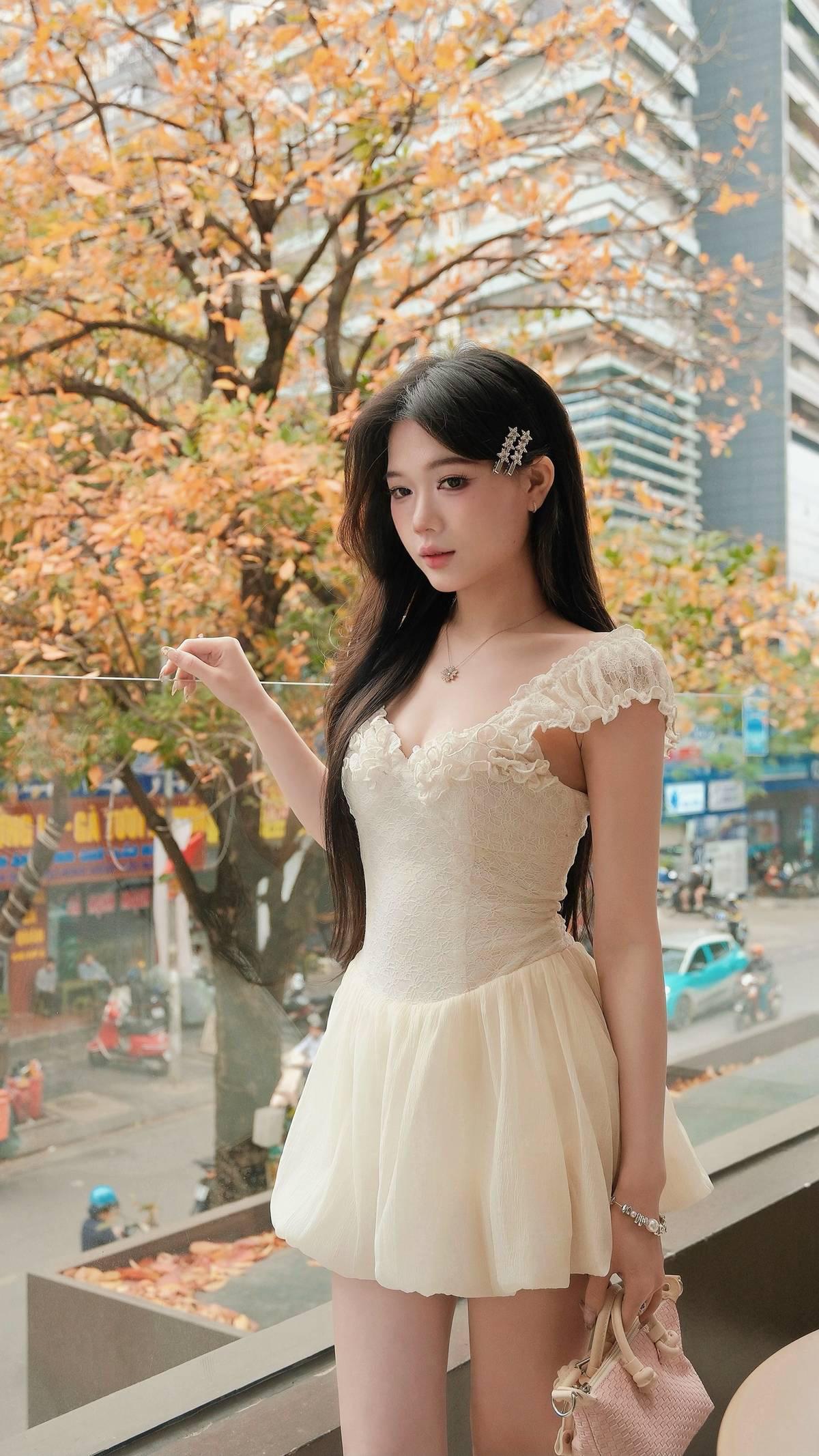 杏色蕾丝连衣裙简直是纯欲天花板☁️