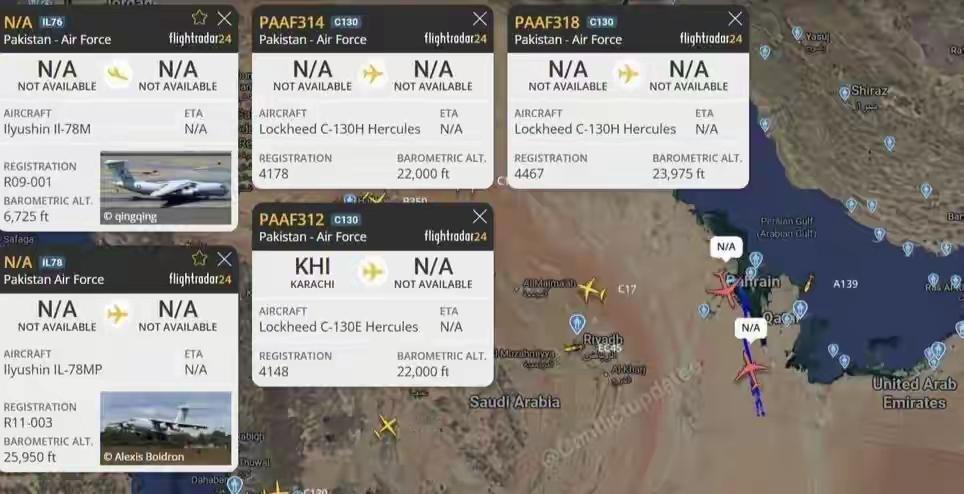 据媒体消息,巴基斯坦空军护航战机进入伊朗领空。此次护航任务共出动2架伊尔 - 78M加油机、1架“萨博”“爱立眼”(Erieye)预警机、4架C - 130“大力神”运输机,以及6架以上的JF - 17“枭龙”战斗机等。