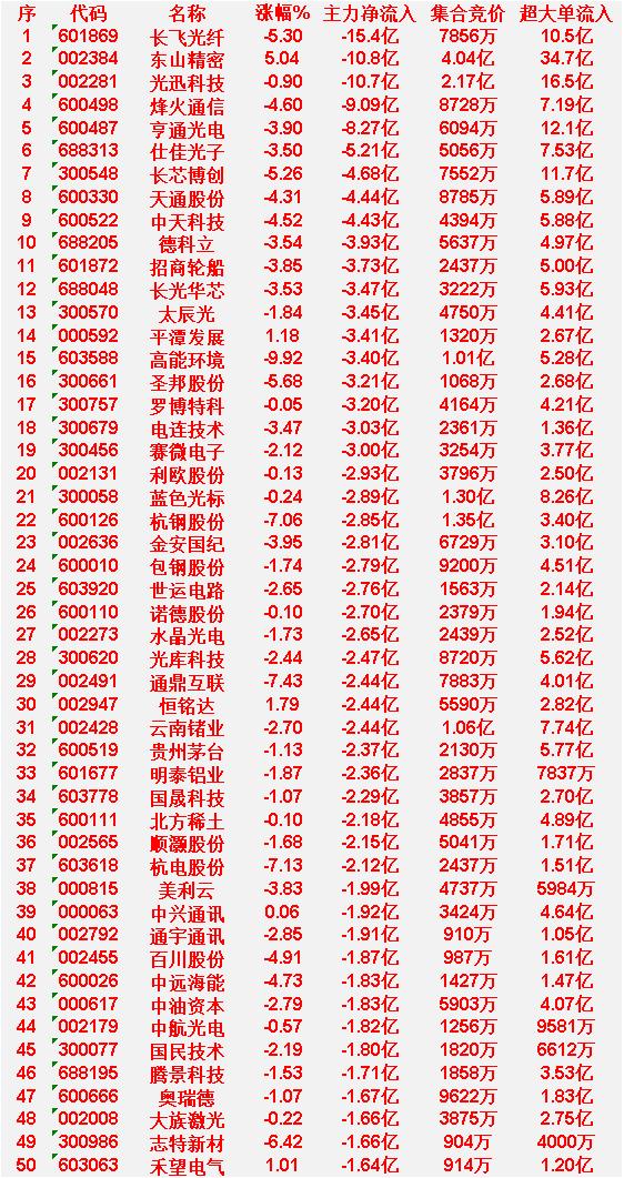 4月10日中午收盘,主力资金“大幅卖出”的50名单: