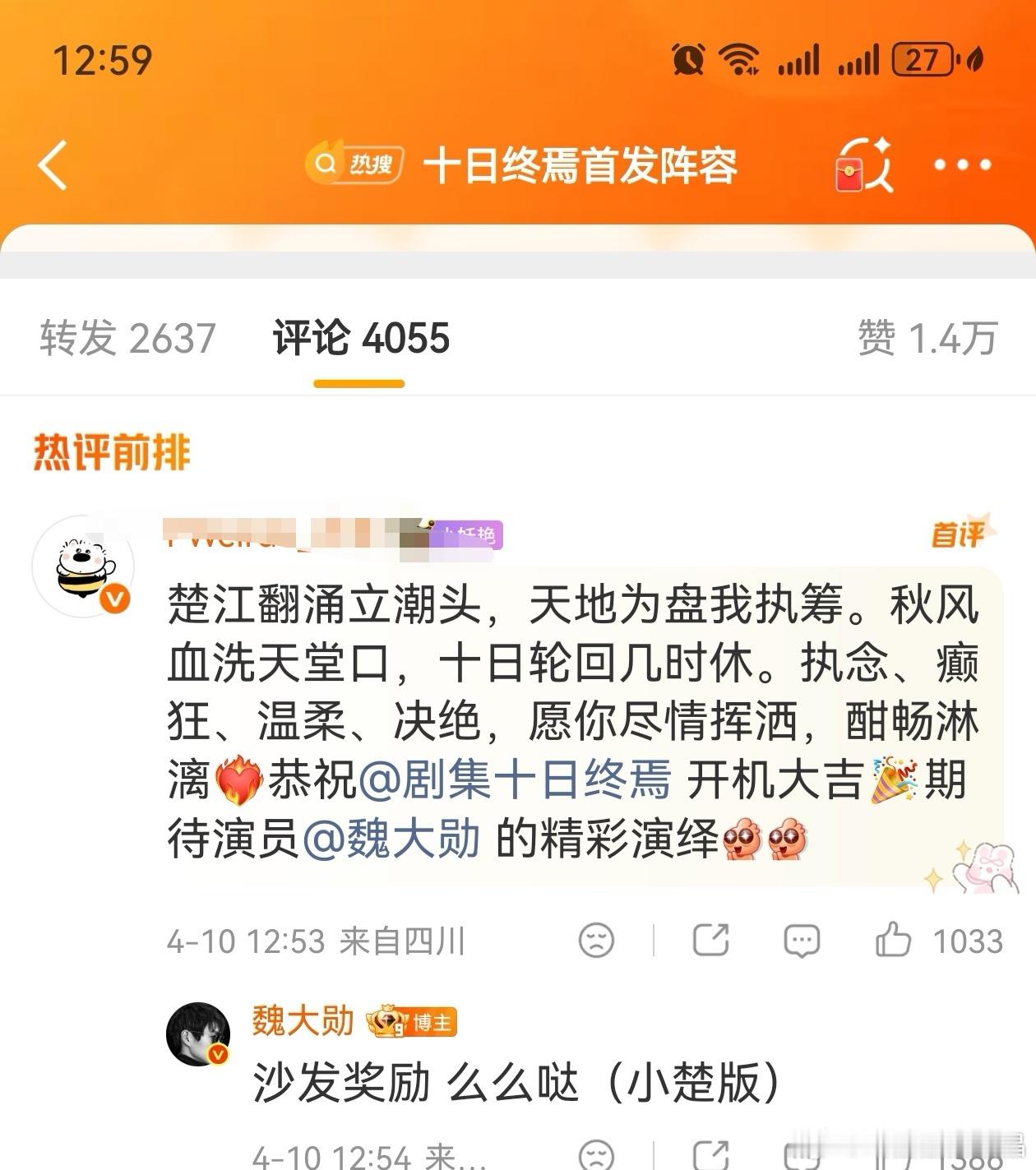 十日终焉首发阵容看得出来魏大勋还挺高兴的,在评论区捞粉丝。