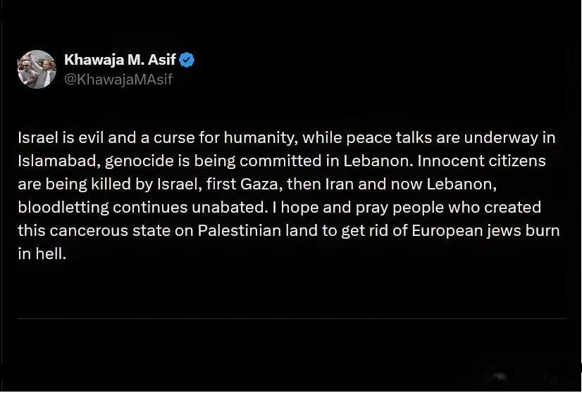 【巴基斯坦防长罕见怒怼以色列,内塔尼亚胡回应】巴基斯坦国防部长哈瓦贾·阿西夫称,“以色列是人类的邪恶与诅咒。当伊斯兰堡正在举行和平谈判时,黎巴嫩却在发生种族灭绝。以色列在杀害平民:先是加沙,然后是伊朗,现在是黎巴嫩,这场流血冲突从未停止。我希望并祈祷,那些为了摆脱欧洲犹太人而在巴勒斯坦土地上建立这个癌症般国家的人,在地狱中燃烧。”巴基斯坦正在调解美伊冲突,以色列也是冲突相关方。以色列的确罪恶昭彰、罄竹难书,但作为调解方的巴基斯坦本应避免极化,劝和促谈,而阿西夫的这番表述包含对以色列国家的全面否定、种族化攻击以及明显的仇恨言论,直接将一个主权国家称为“邪恶、诅咒、癌症国家”,并诅咒相关人群“下地狱”。巴基斯坦人对以色列的怒火可见一斑。内塔尼亚胡称,“巴基斯坦国防部长呼吁消灭以色列的言论令人愤慨。任何政府都不能容忍此类声明,更何况是一个自称在和平事务中持中立调解立场的政府。”