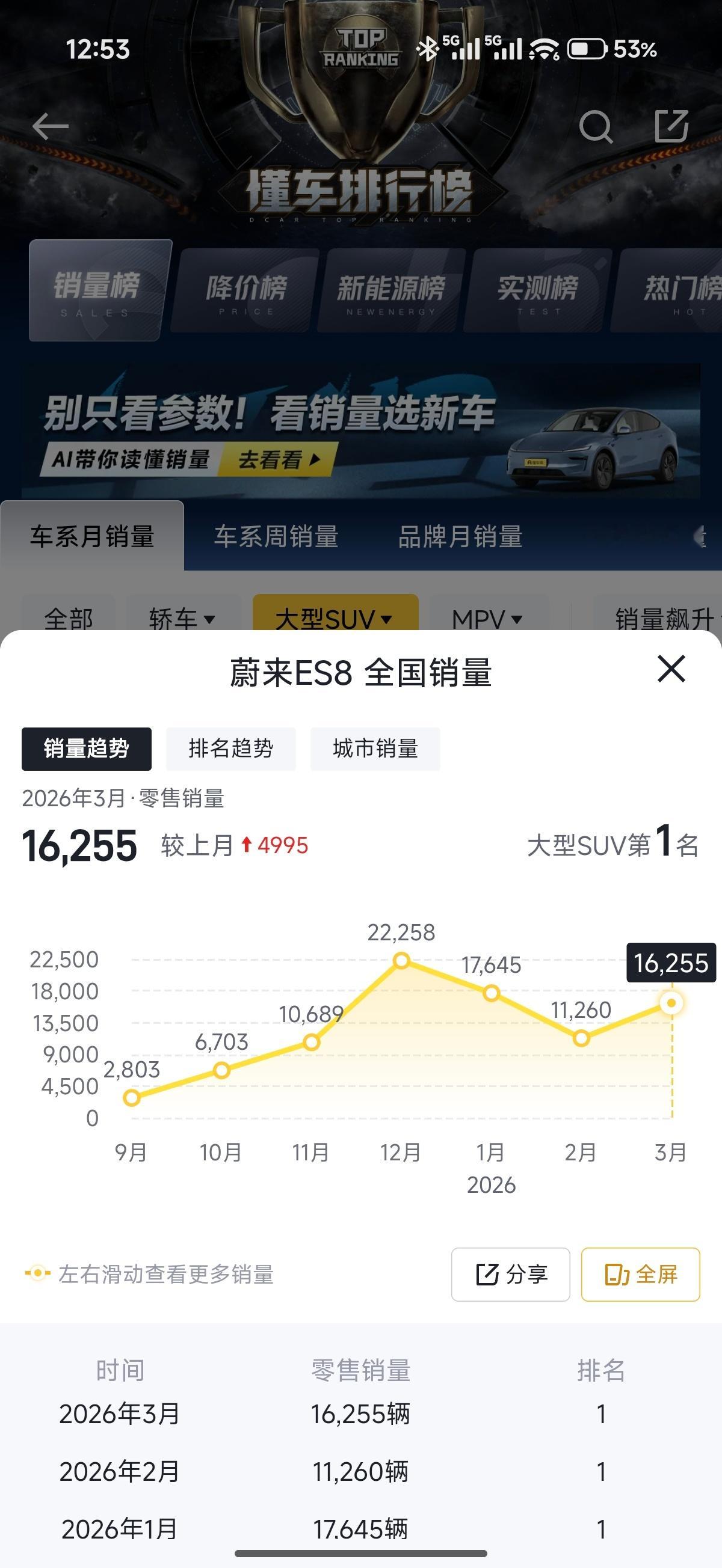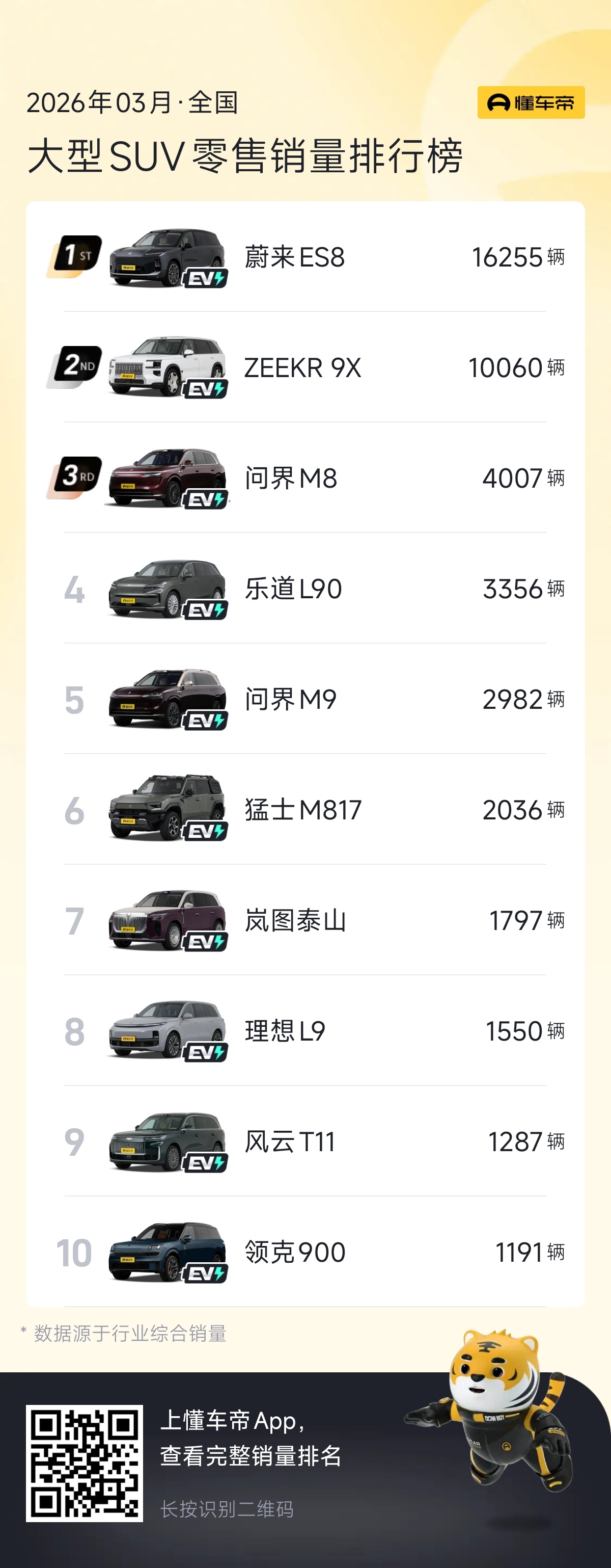 3月大型SUV销量榜单出炉,蔚来ES8和极氪9X卖得是真的好,销量还在疯狂涨!这