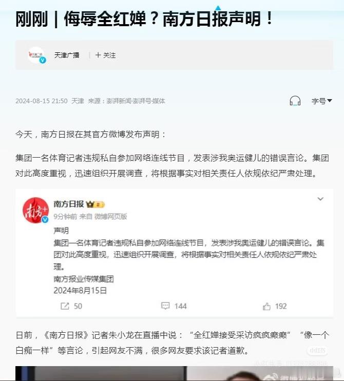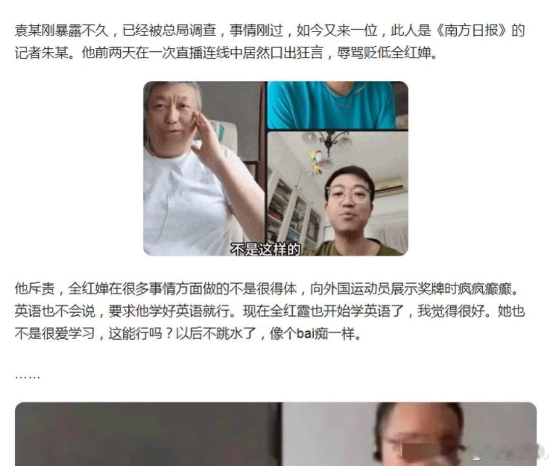 2024年巴黎跳水冠军全红婵,在某平台直播时,被南方日报记者朱小龙嘲讽,记者:“教你在巴黎用英语表达小小拿捏怎么说”?全红婵:“不用了,不想知道”。记者:“全红婵给德国运动员展示金牌的时刻疯疯癫癫,她开始学习英语了,好在是学习英语了,作为长大的一个人,不可能跳水一辈子,你不跳水以后像一个白痴一样能行吗
