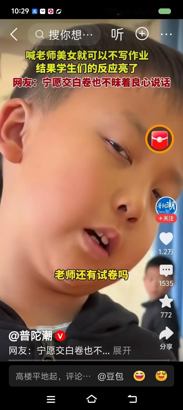 据报道,女老师说:“喊我美女,周末没作业。”学生一个个领了作业。到最后一个,没了。他说:“还有试卷么?”
