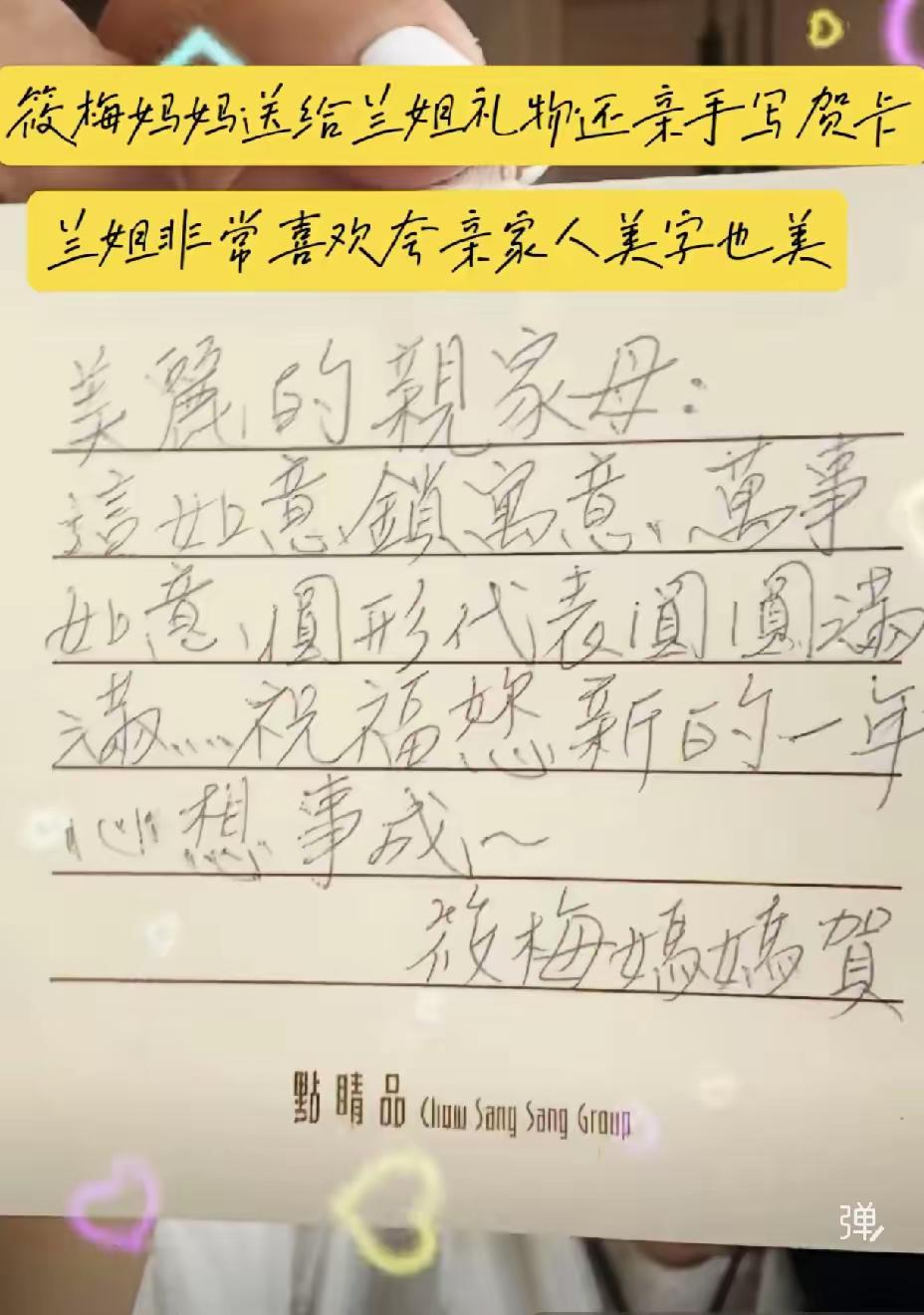 张兰收到亲家母筱梅妈妈的礼物,开心得嘴都合不拢了。张兰生日收到亲家母的贵重礼物,其实贵重与否不重要,关键是两家人的和睦相处让人羡慕,筱梅妈妈还贴心的写上祝福语寓意非常好,万事如意圆圆满满,看得出来马筱梅的妈妈很用心。