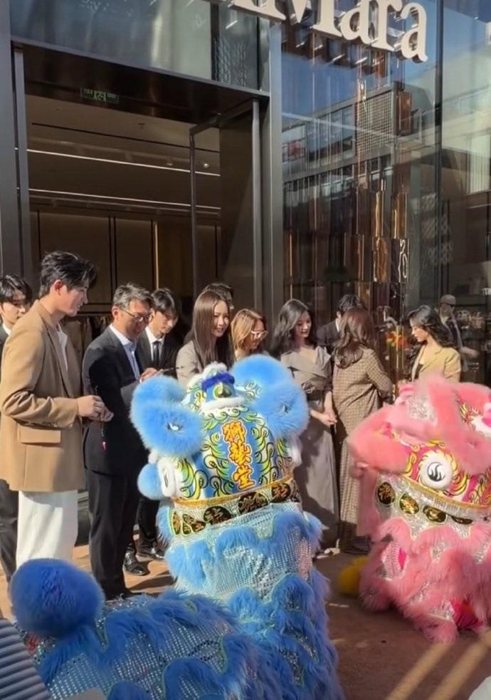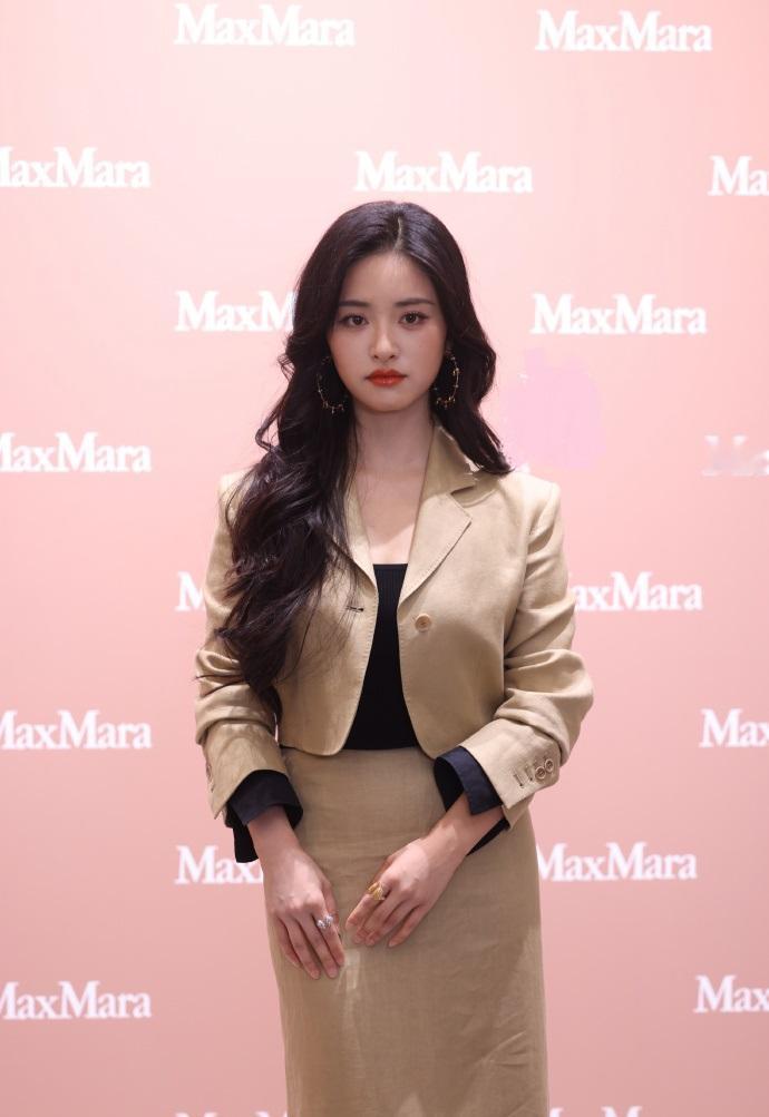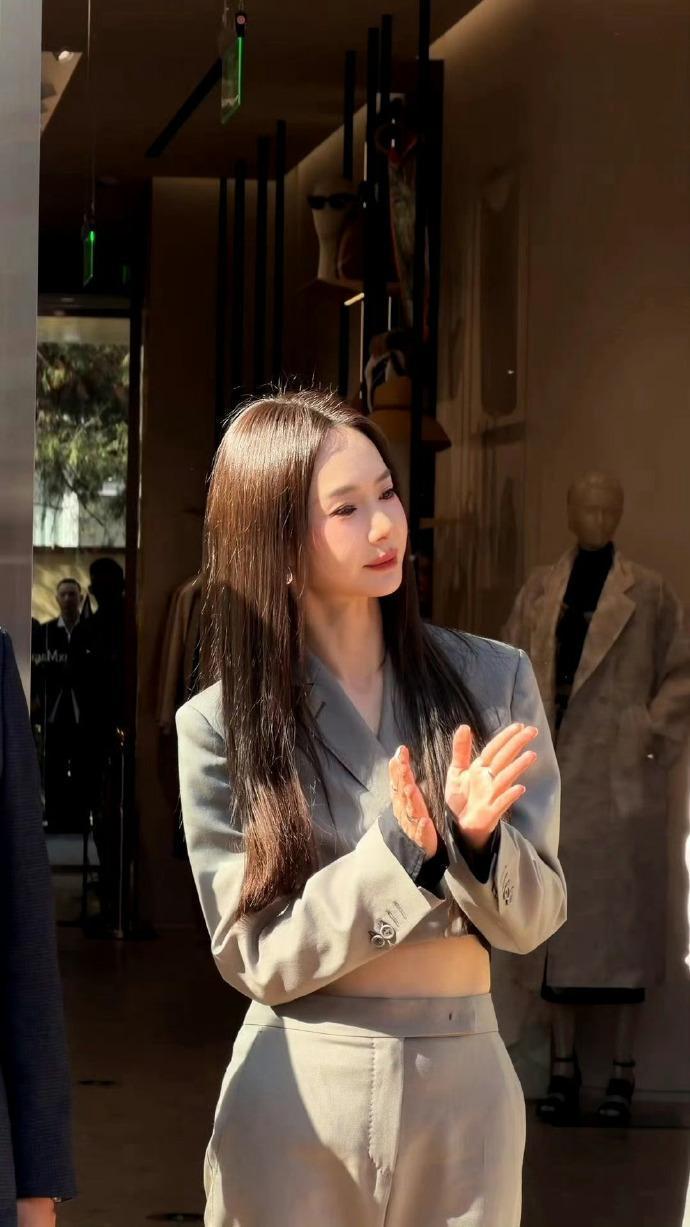 沈月里面穿黑色打底衫,外面套着浅色的套装,脚踩黑色绒面高跟鞋,还留着超美的大波浪卷长发,凸显出了满满的浪漫感,效果太完美了。