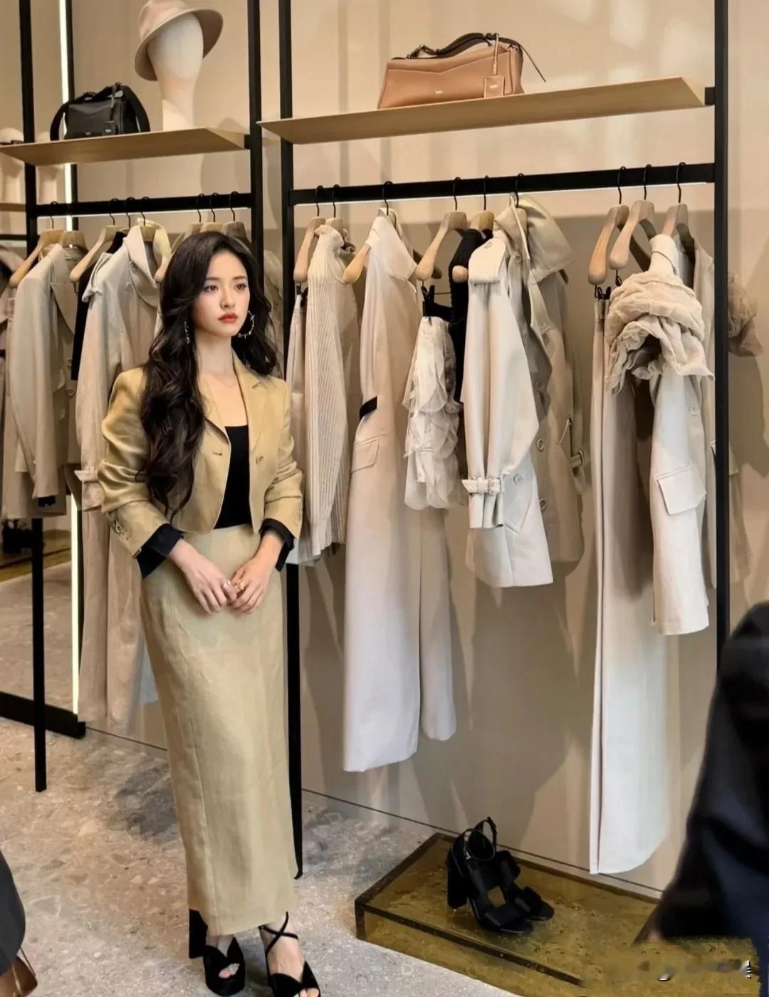 沈月这次的穿搭好美,好适合她的脸,一头长长的波浪卷,搭配棕黄色套装长裙,脚踩黑色粗高跟,五官精致,很美,很有御姐范!