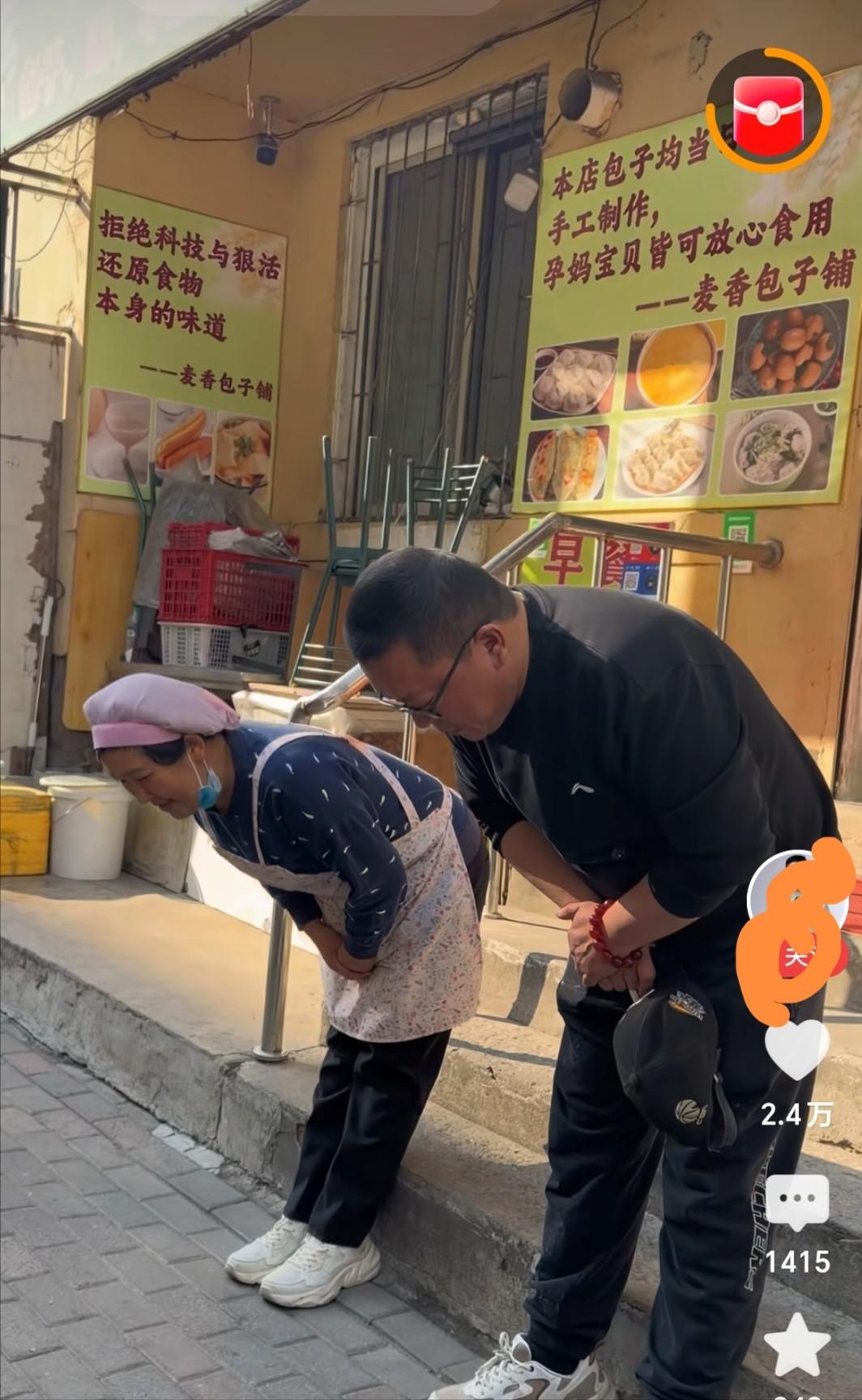 饭馆老板两口子立刻收拢双脚,双手贴紧裤缝,极其庄重地压低脊背后倾。一个毫无保留、甚至略带仰视情绪的标准大鞠躬。