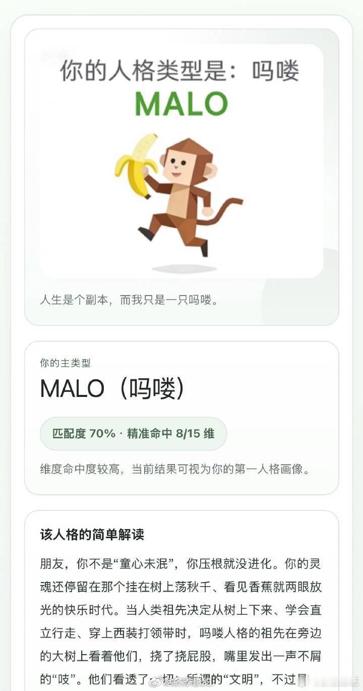 徐若晗的sbti是malo 第一次听说sbti还有malo这个选项,徐若晗真的是会玩。五十公里桃花坞里的她本来就活泼又跳脱,现在用吗喽型人格来解释一切都说得通了,快乐小猴实锤了。