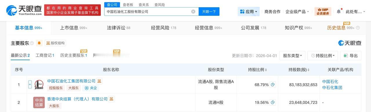 中国石油化工股份有限公司成立于2000年2月,法定代表人为侯启军,经营范围包括矿产资源勘查、陆地石油和天然气开采、化工产品销售等。股东信息显示,该公司由中国石油化工集团有限公司、香港中央结算(代理人)有限公司等共同持股。