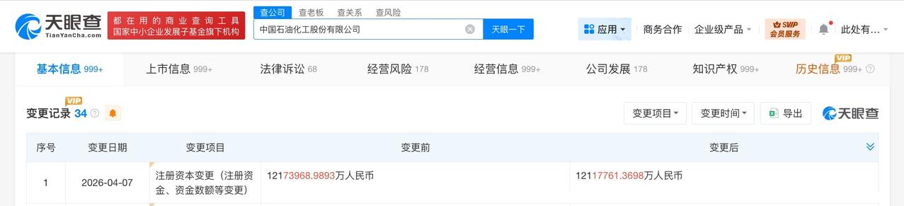 天眼查工商信息显示,近日,中国石化(600028)发生工商变更,注册资本由约1217.4亿人民币减至约1211.8亿人民币。