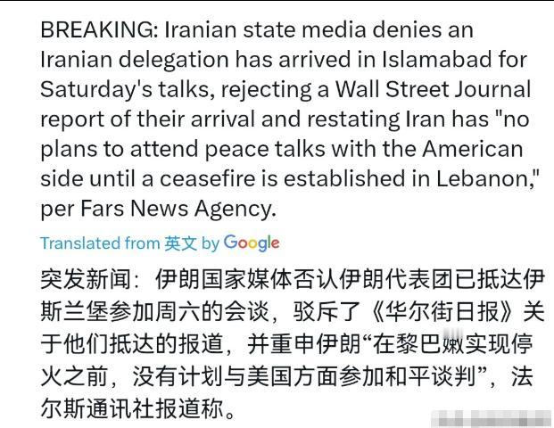 4月10日,根据伊朗法尔斯通讯社报道,伊朗官方媒体公开否认伊朗代表团已抵达伊斯兰堡参加周六的会谈,并驳斥了《华尔街日报》有关代表团抵达的报道。不仅如此,伊朗方面重申:在黎巴嫩实现停火之前,伊朗无意参加与美方的和平谈判。