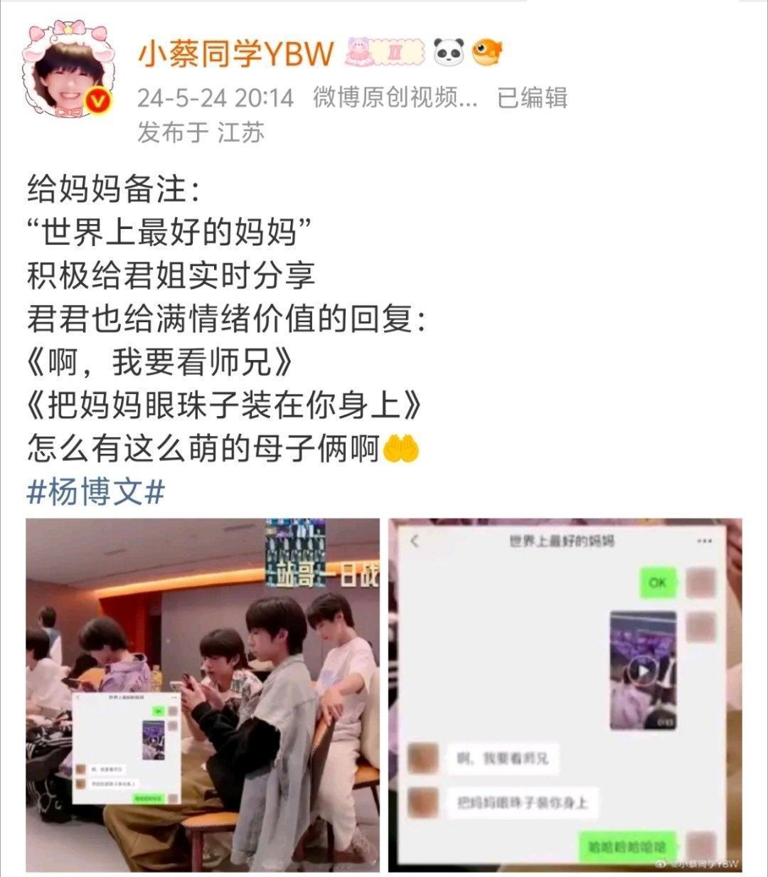 剧外的杨博文也同样爱着妈妈,看到有趣的东西会第一时间分享给君君,给君的备注是“世界上最好的妈妈”