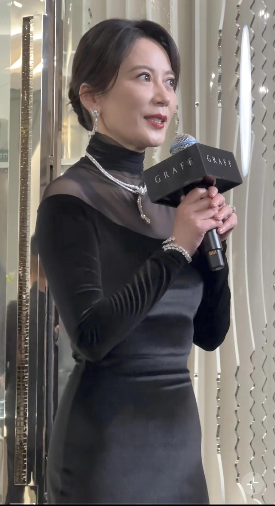 俞飞鸿穿了一件修身的黑色长裙子走了出来,是高领的,中间有蕾丝露出脖颈,首先看她的身材就不好,原因是小腹隆起了,被衣服勒出来一层赘肉,肯定是年龄大了胖了。