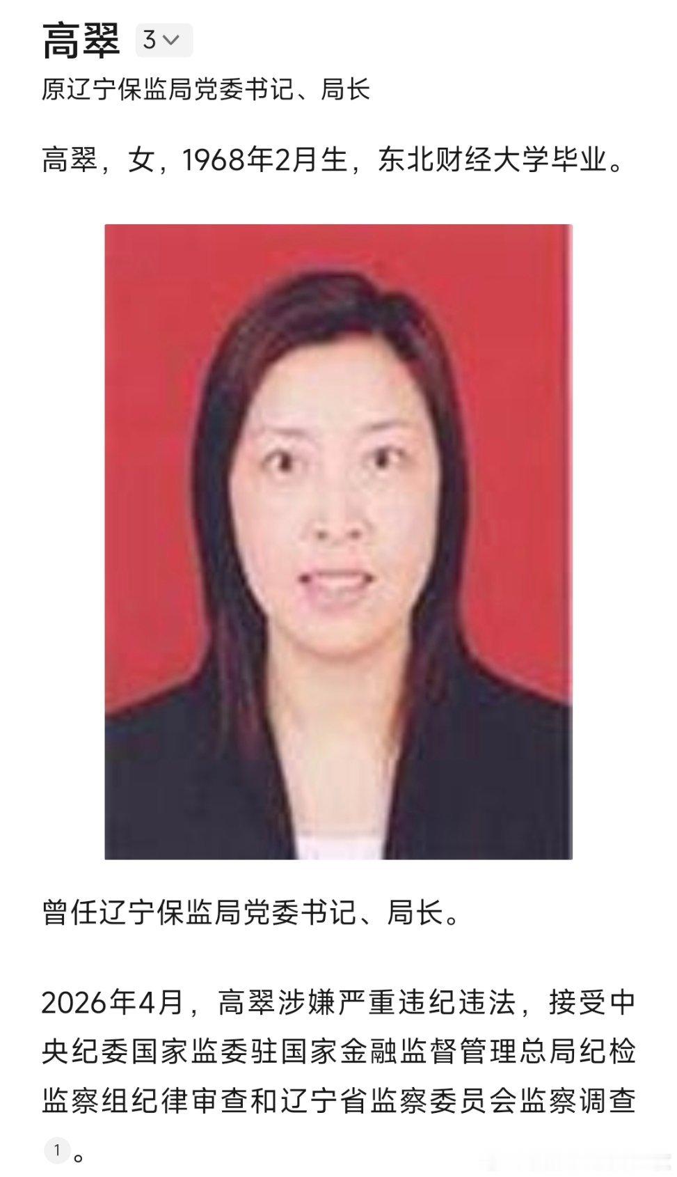原辽宁保监局党委书记、局长高翠接受审查调查!