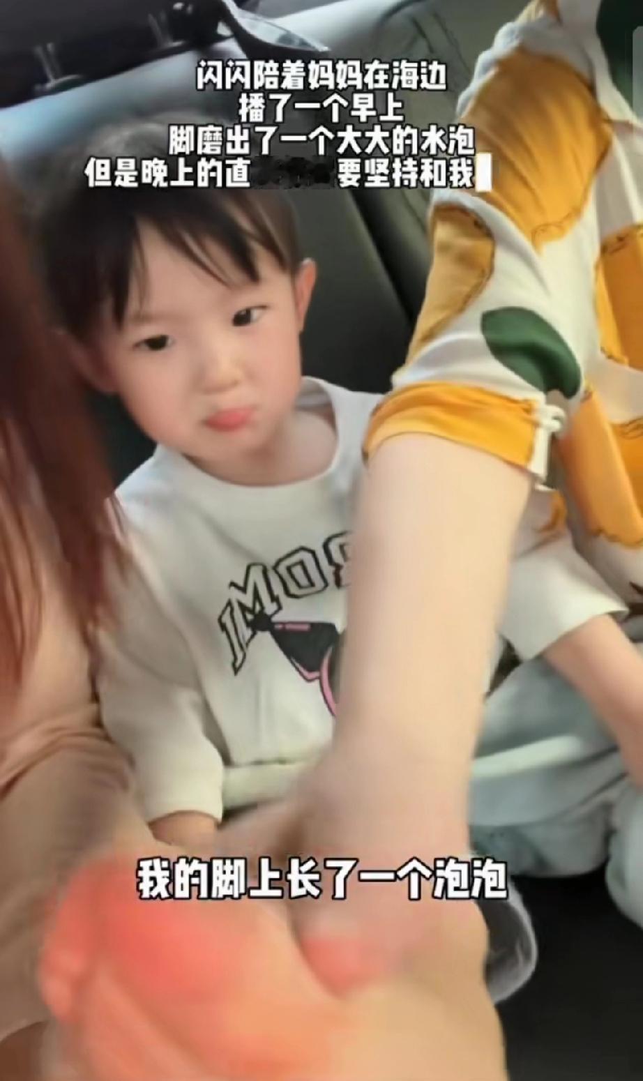 海南的海边又热又晒,闪闪竟然全程都跟着妈妈在直播,下播后发现脚上磨了一个大水泡,闪闪说很疼很疼,坚强的小姑娘没有哭,闪闪的姥姥说给她贴个创可贴,闪闪还不忘问妈妈:“有没有冰冰凉凉的创可贴?”