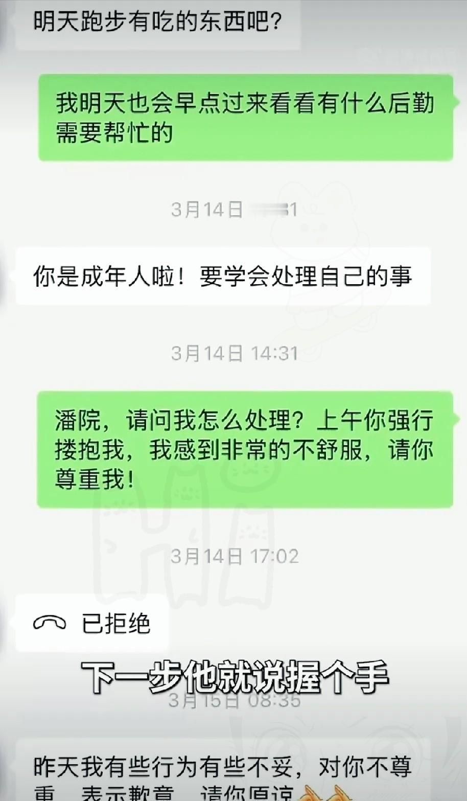 杭州爱尔眼科医院前院长潘某某,3月14日在办公室关灯后搂抱、摸脸、让女销售坐他腿上,对方激烈反抗后才作罢。