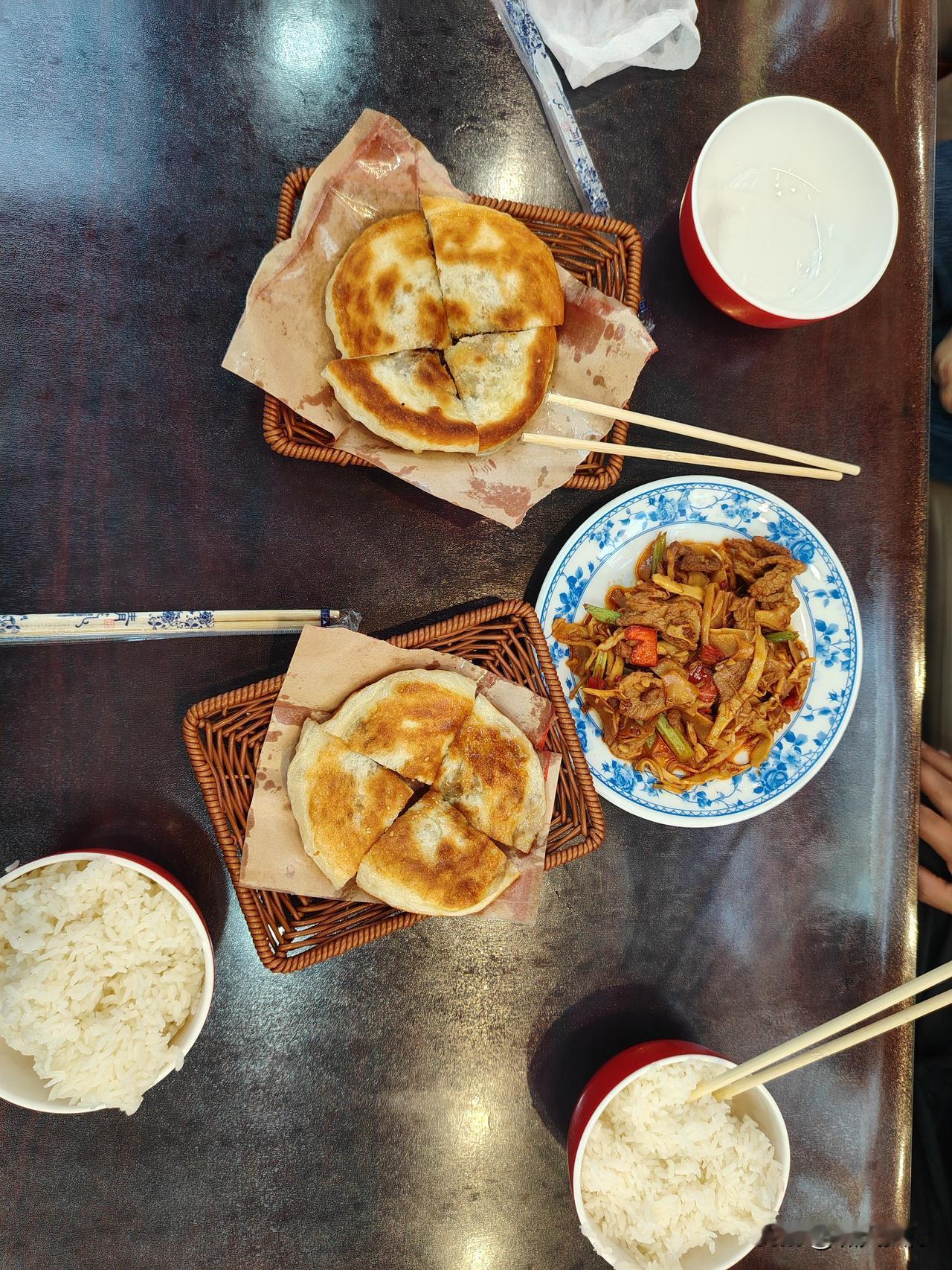 傍晚,步行到大成路口,一家路边店吃饭,都是当地特色和小炒。我们点了两块牛肉饼(一块饼一两肉)、小份七秒炒猪肝、竹笋炒肉、炒时蔬,两碗米饭。真好吃真香,三个人不到60元。