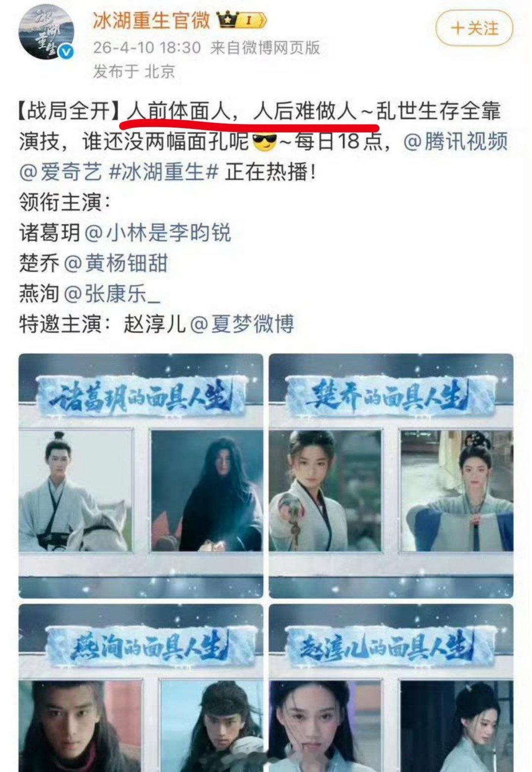 赵丽颖工作室发了《楚乔传》的内容,解读大女主内核张萌:有被内涵到更新:冰湖重生 的新文案“人前体面人,人后难做人”,不过已经删了赵丽颖工作室发楚乔传采访