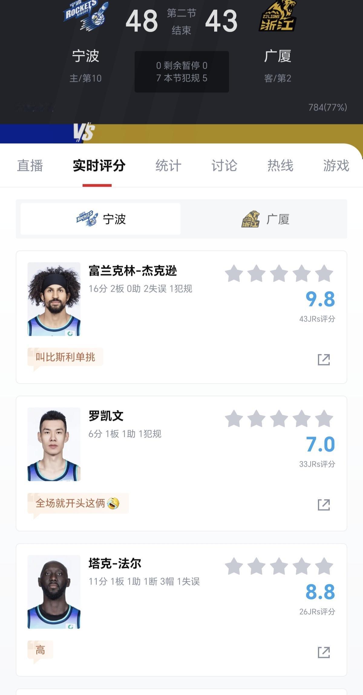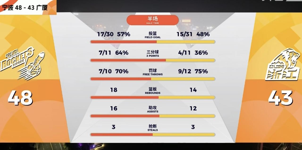 宁波队这是要在主场,掀翻卫冕冠军广厦队的节奏呀!在火速铲除了刺头外援贝兹利后,宁波男篮显得空前团结团结,士气大振,拼劲十足。整个上半场,宁波男篮一度领先广厦男篮15分。小外援里突外投,半场拿下16分,抢了第一外援辛普森的风头。法尔在内线一柱擎天,威慑力十足。刘晓宇传球被断,反抢回来,不看人传球,助攻法尔暴扣。内线老将俞长栋脚部受伤,下场治疗一下又火速返回。尤其是宁波队的外线,今天非常准。11投7中,命中率高达64%。总之是宁波球员非常拼,似乎有不拿下广厦誓不罢休的气势。