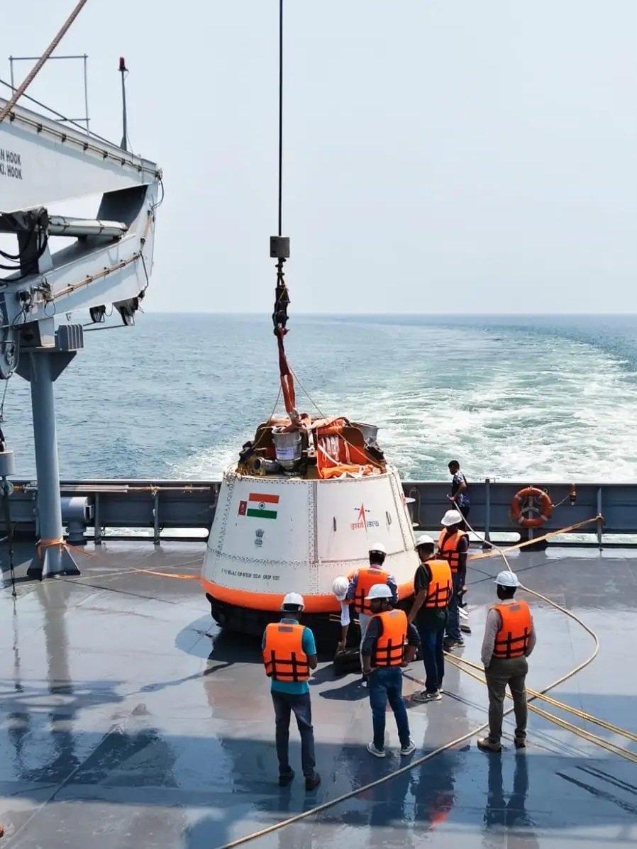 在本次试验中,重达 5.7 吨的机组舱由一架支奴干飞机携带,从斯里哈里科塔海岸附近孟加拉湾上空 3 公里的高度投放。随后,机组舱使用一系列锥形降落伞和主降落伞自主减速,并以柔和的方式溅落海中。