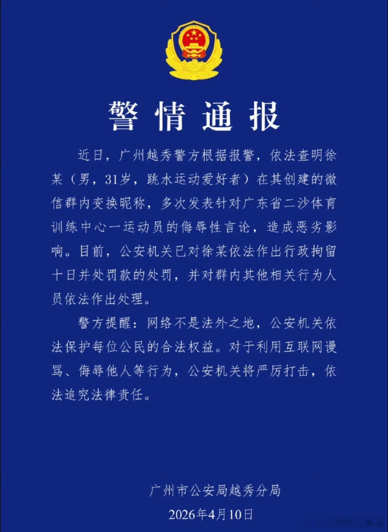 男子微信群多次侮辱全红婵被拘这是报复社会人格吧……为国争光的奥运冠军都骂??拘进