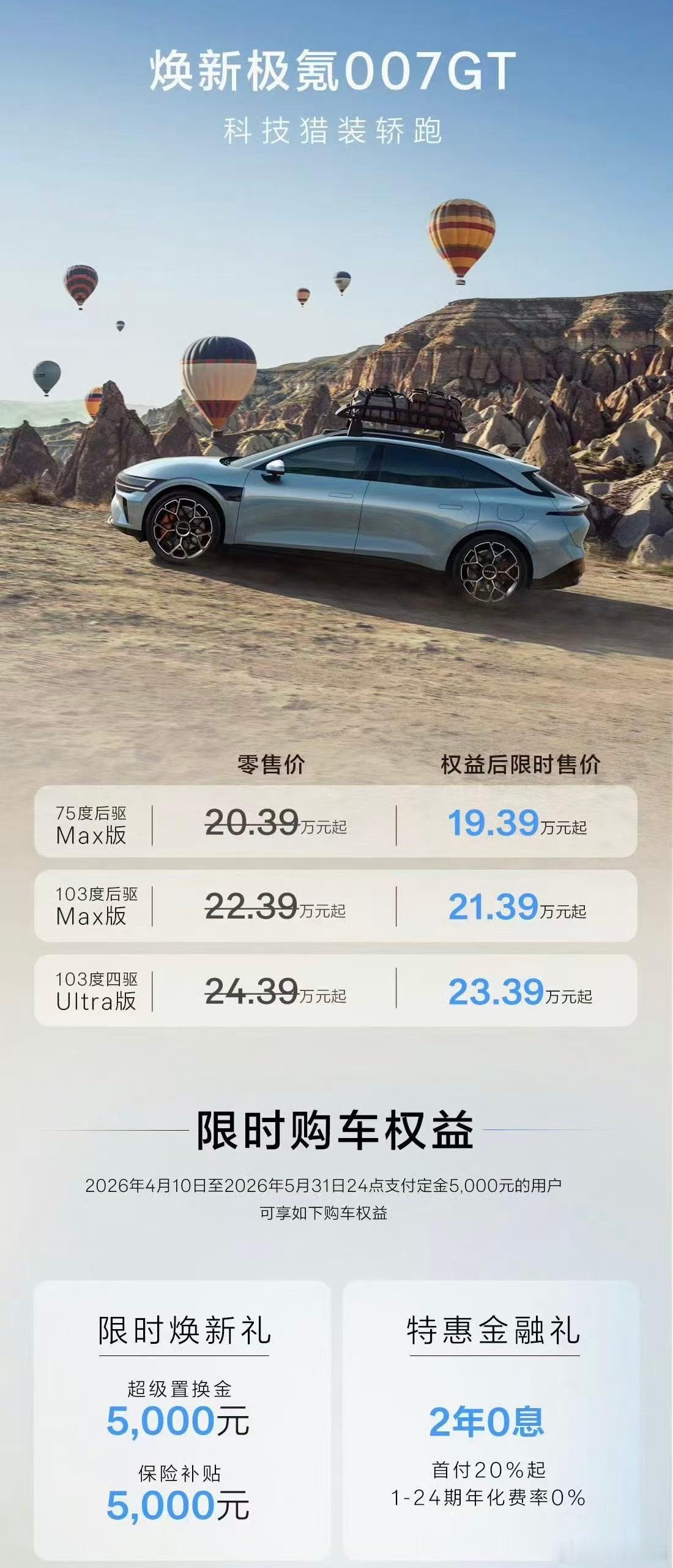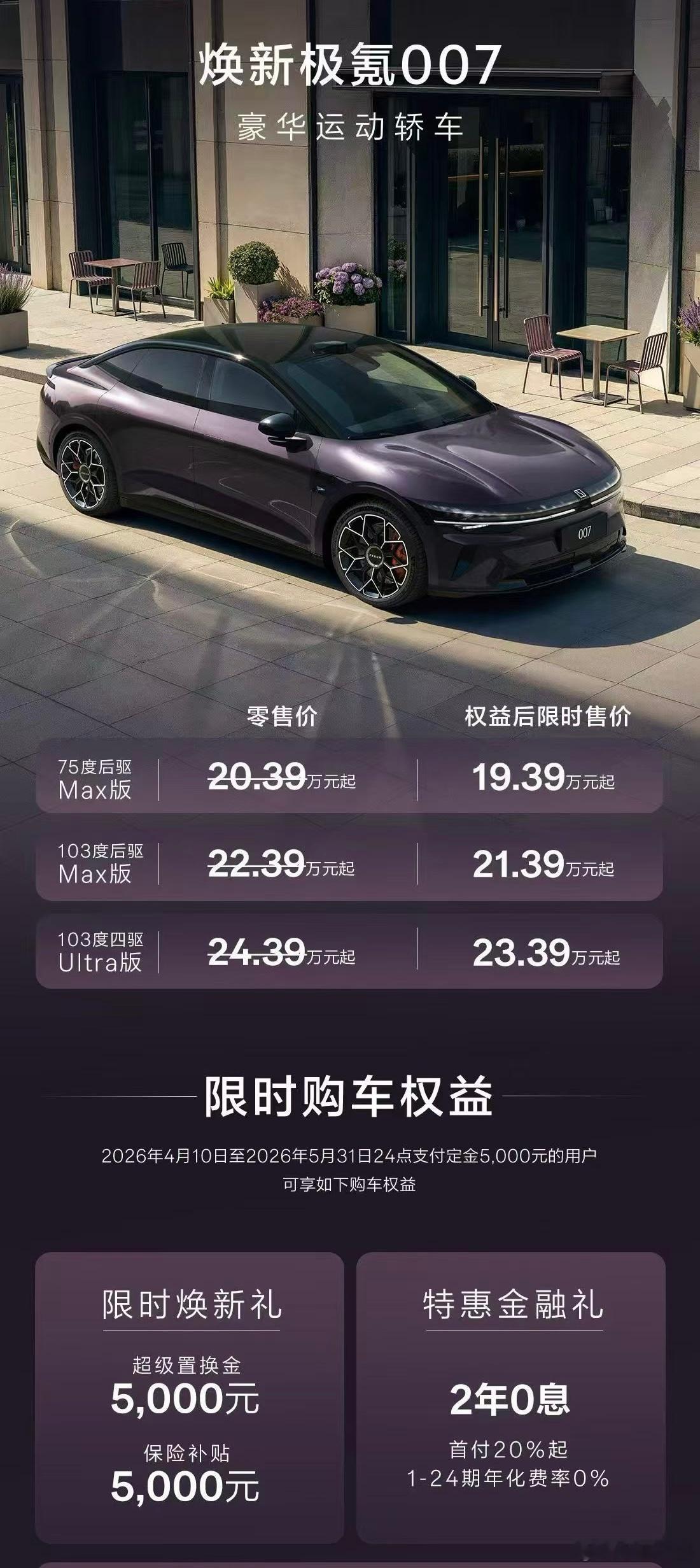 当然对于汽车品牌来讲,档次和销量通常都想要,所以极氪的入门车型和中端车型也得能打。今天新款007/007GT也上市了,指导价20.39-24.39万元,权益后限时售价19.39-23.39万元。