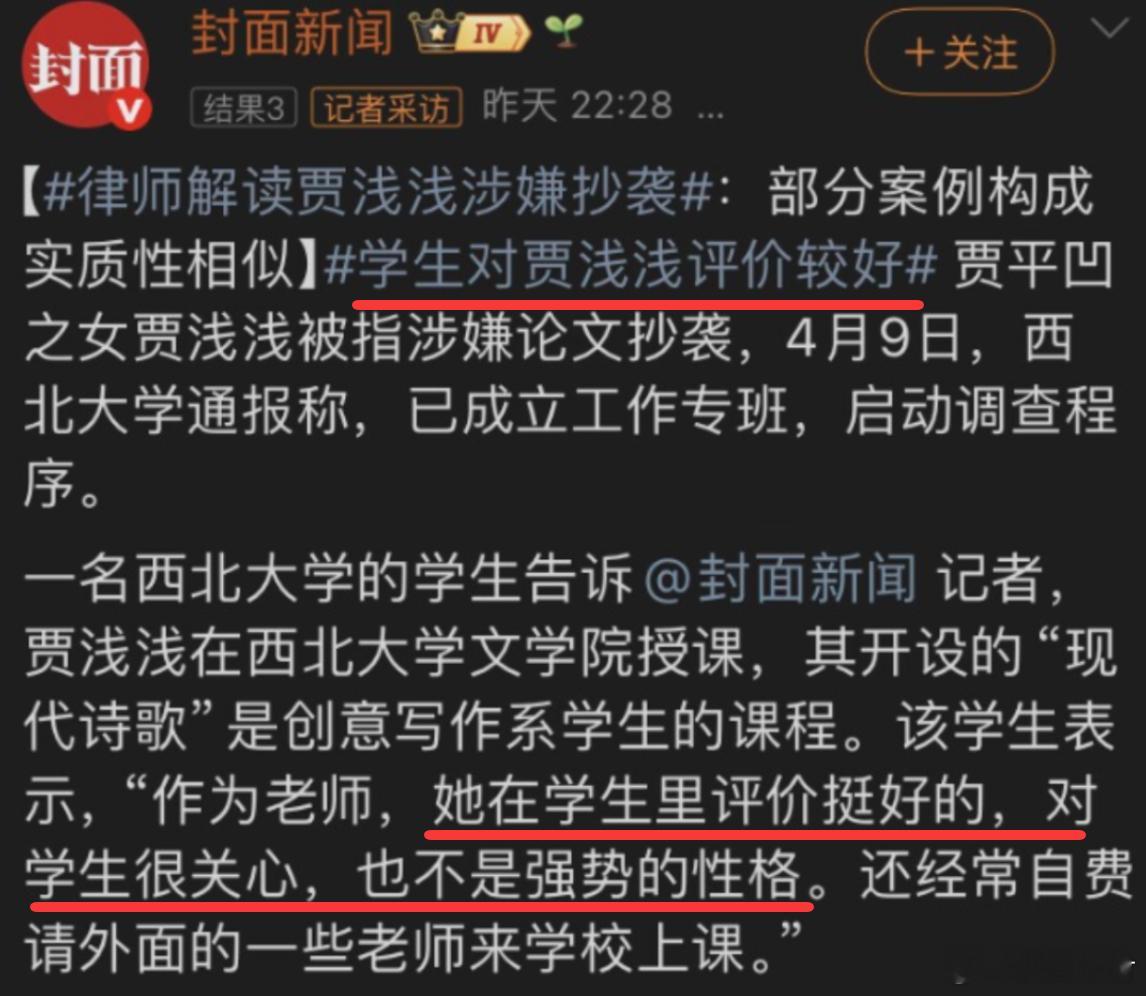 就在昨天,关于贾浅浅(西北大学副教授、贾平凹之女)的论文涉嫌抄袭的事,西北大学发布通告称,学校对此事高度重视,而且已经成立了工作专班,对此事启动了调查程序。
