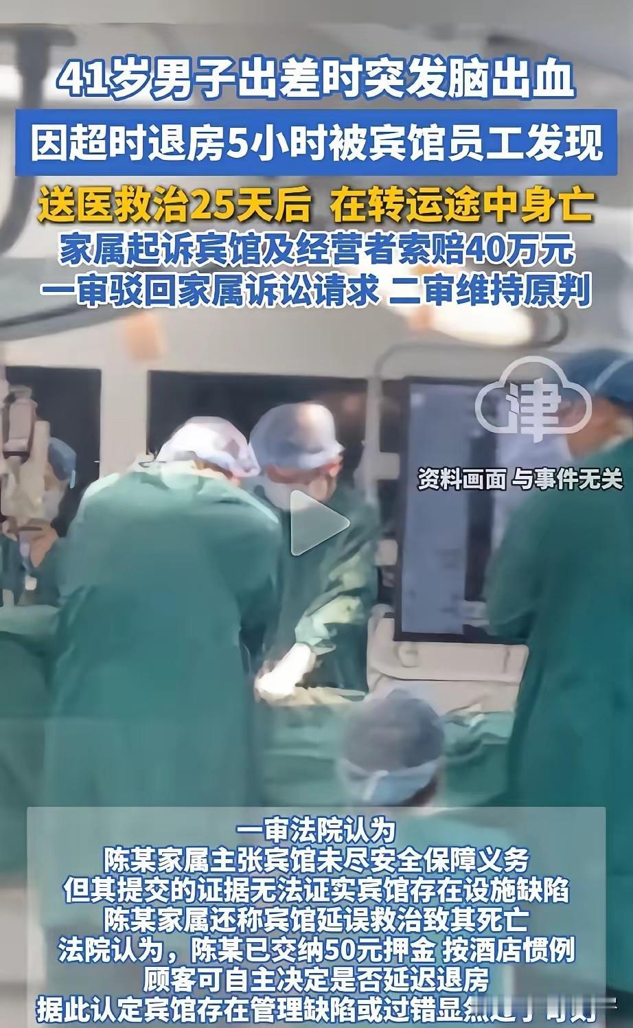 一名41岁男子因公出差,为节省费用,以48元房价外加50元押金入住一家小旅馆。到了退房时间,男子一直没有出现,店员以为要续住便没多问,直到5小时后仍无动静才感觉不对并报警。开门后发现男子倒地,送医查出脑出血,治疗25天无效,转院途中不幸去世,家属随后将旅馆告上法院,索赔40万元。