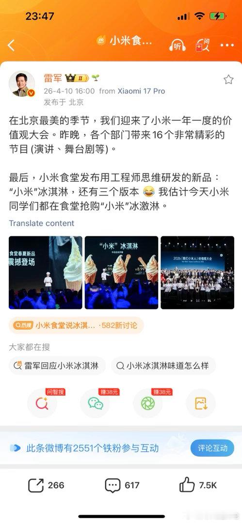 4月10日,小米冰激淋在网上火了,原因是4月9日,小米举行了“价值观大会”。第二天,食堂推出了用工程师思维研发的新品:以真实小米颗粒为特色原料,并沿袭小米产品矩阵式命名逻辑,分为标准版、Pro版、Max版三档定价(5.99元/6.99元/8.99元),这已经成为今天的话题。雷军后来解释了这件事的来龙去脉。雷军回应小米冰激淋