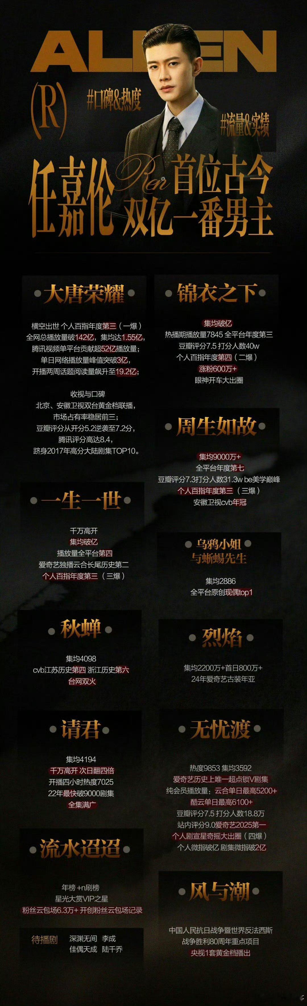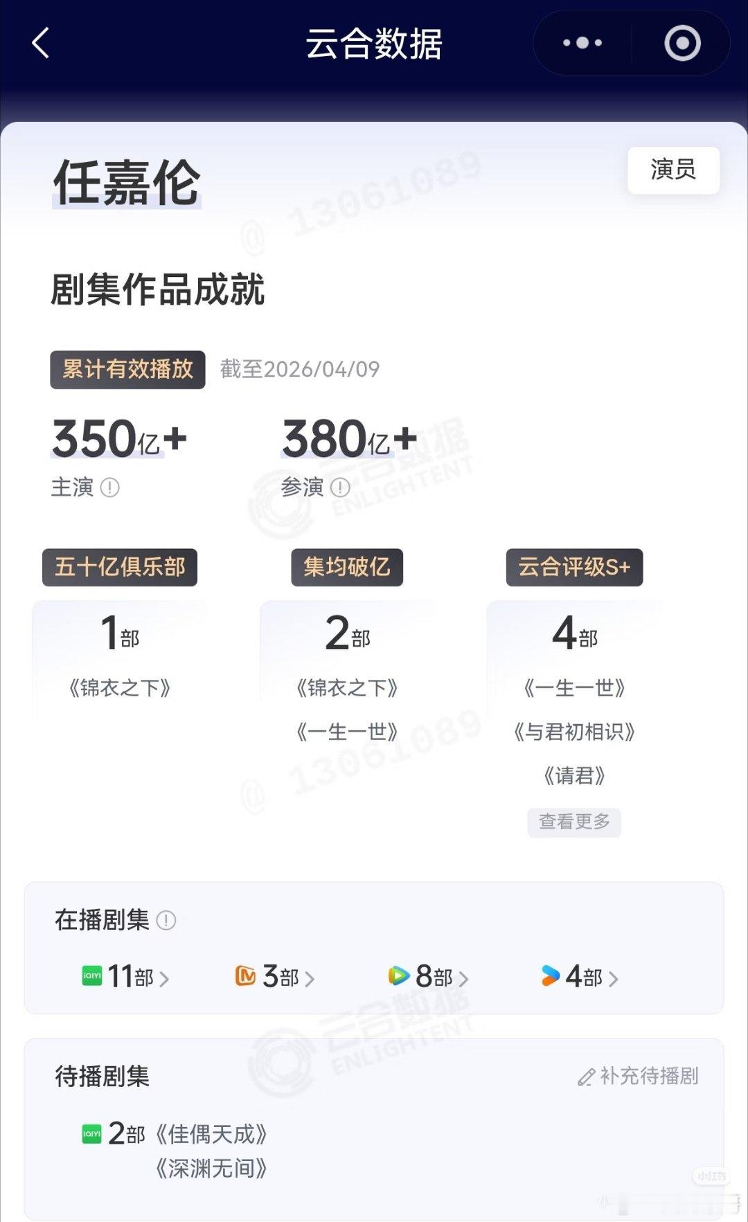 截止到4月9日,即将37岁的任嘉伦云合累计总播放量已破380亿,主演播放量已破350亿,不仅拥有大唐荣耀、锦衣之下、周生如故、无忧渡、风与潮等数部大爆剧,且是首位古现均有集均破亿剧集的男演员,从2017到2026已长红九年!
