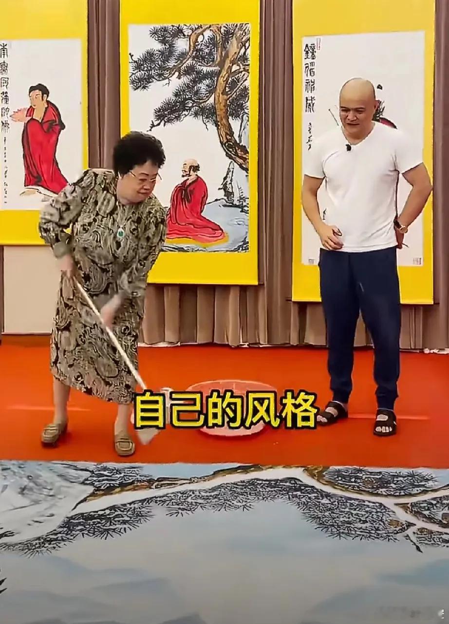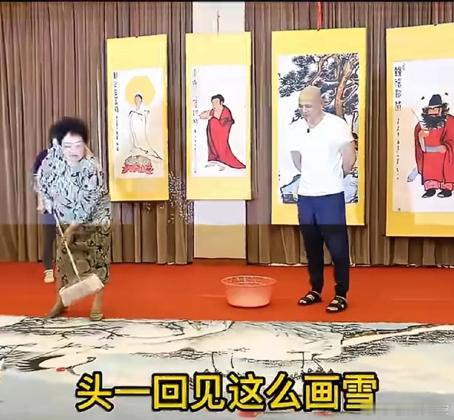 第一个,她不过是拿着扫帚在画布上随意挥舞了几下,主持人却连连夸赞,直言这幅画有北国风光的磅礴意境。