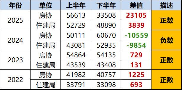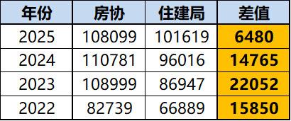结论二:在年度口径下,房协数据同样持续高于住建局,近四年平均差值约1.5万套。