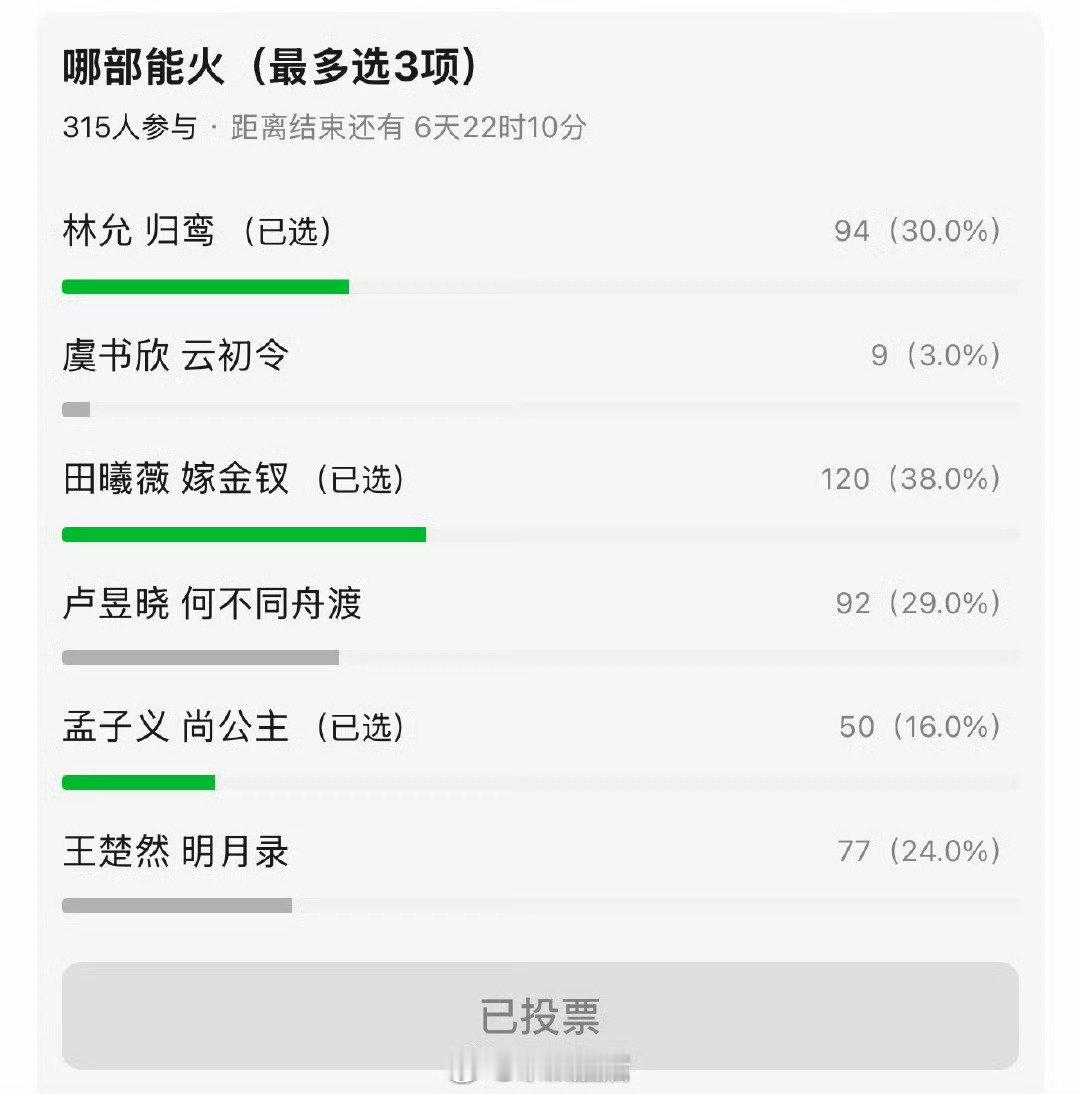 豆瓣发起的在拍古偶剧女主路透,谁能🔥的投票中,田曦薇嫁金钗、林允归鸾、卢昱晓何不同舟渡最被看好。