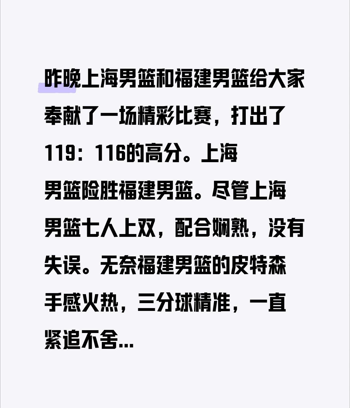 昨晚上海男篮和福建男篮给大家奉献了一场精彩比赛,打出了119:116的高分。上海